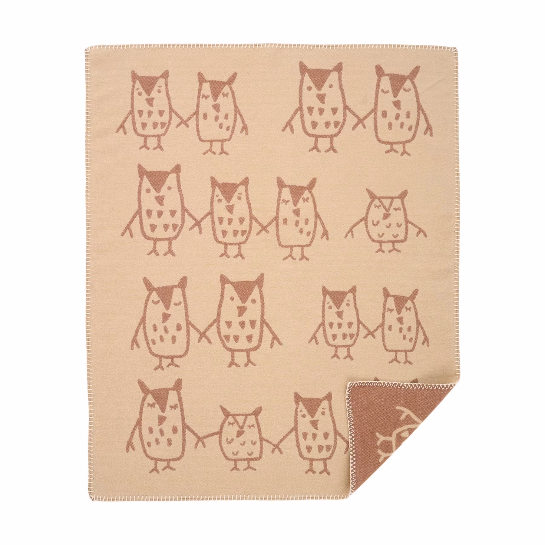 Den borstad bomullsversionen av Hand in hand är designad av Bitte Stenström och mäter 70×90 cm och erbjuder ett extra mjukt alternativ för barn med känslig hud. Motivet är samma kärleksfulla ugglor som i ullvarianten. 70×90 cm. 100 % borstad bomull.
