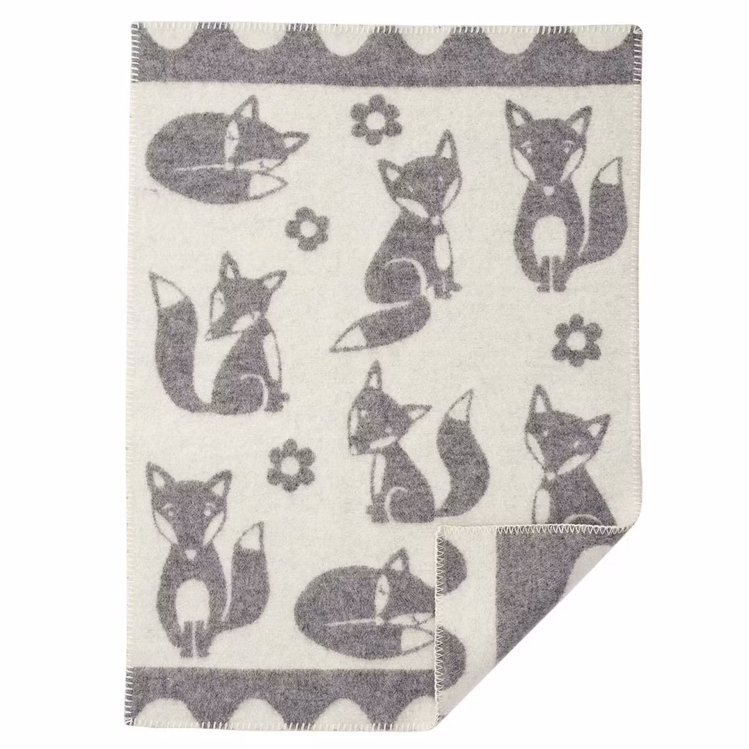 Vår härliga ullfilt Fox är designad av Bitte Stenström och är tillverkad i 100% lammull. Fox har ett vackert och lekfullt mönster med söta små rävar. Filten är både en värmande och dekorativ detalj som är perfekt att ha i barnvagnen under kvällspromenaderna.