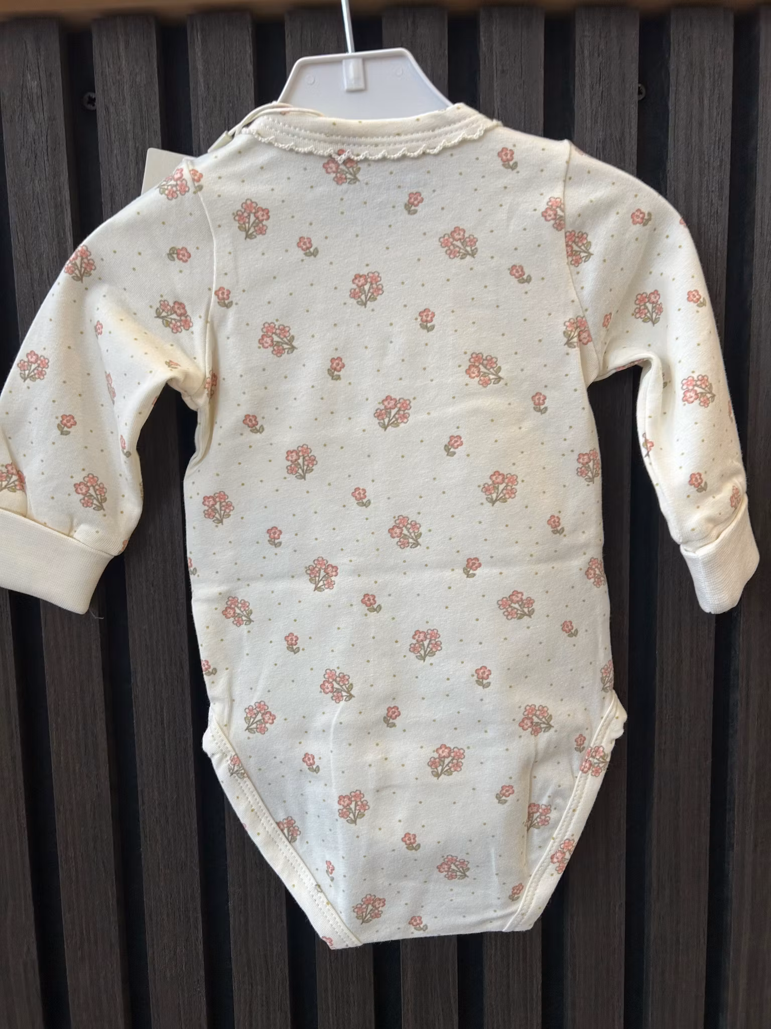 Body med liten spetskrage i halsen, blommor i rosa färg samt prickar.