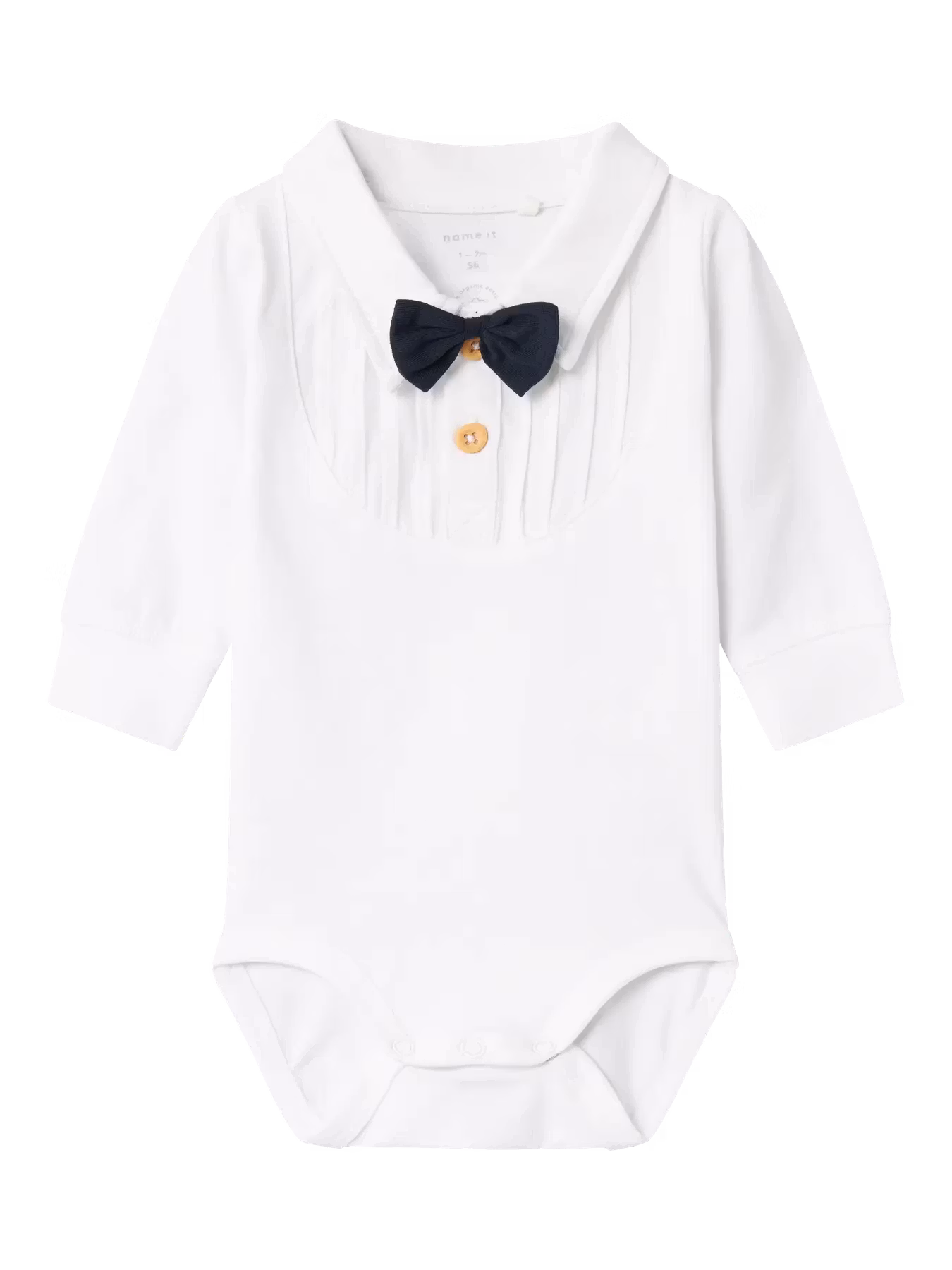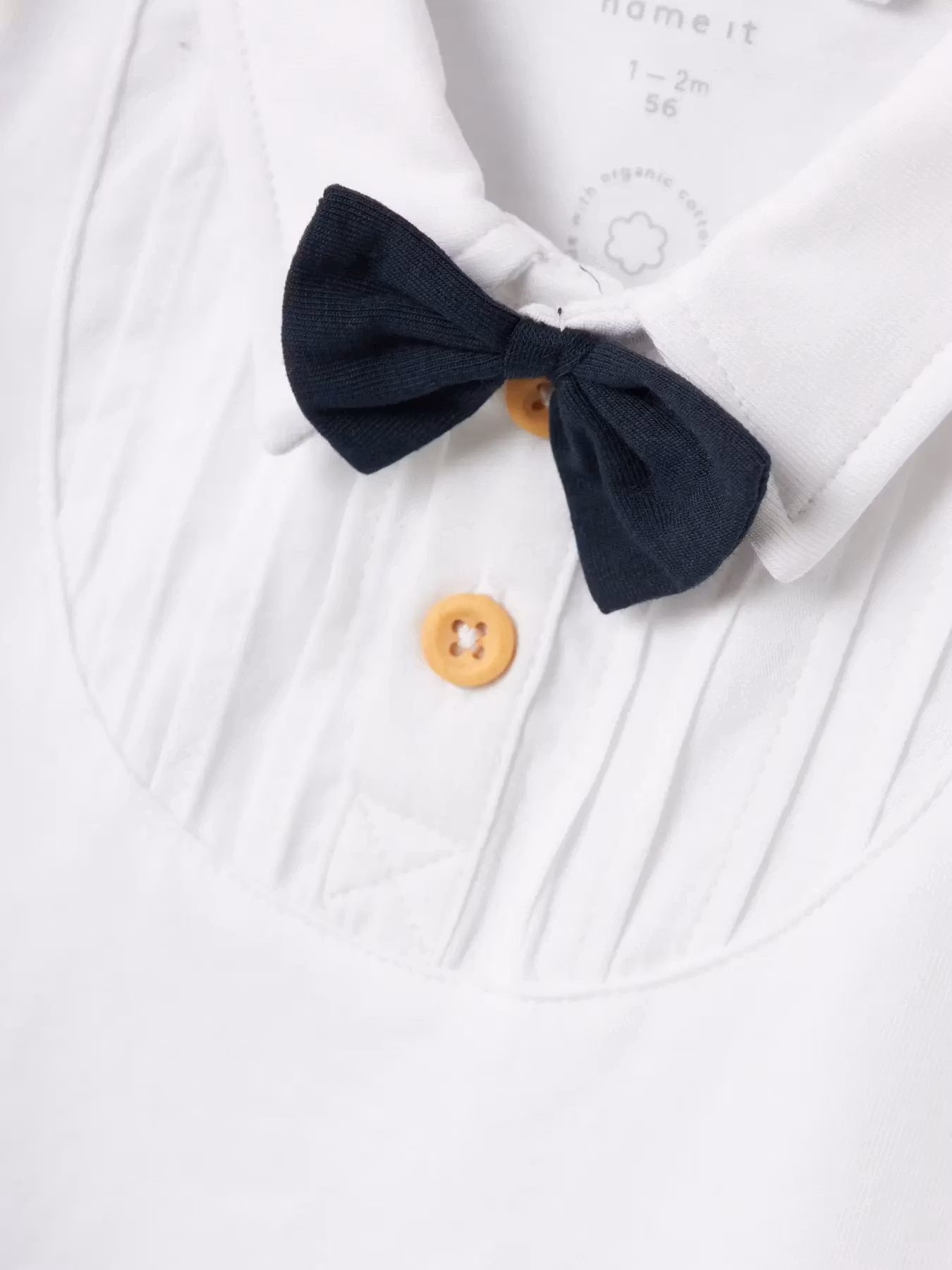 Body med fina detaljer, såsom fluga och krage. Otroligt mjuk och skön i kvaliteten.Märke: Name it