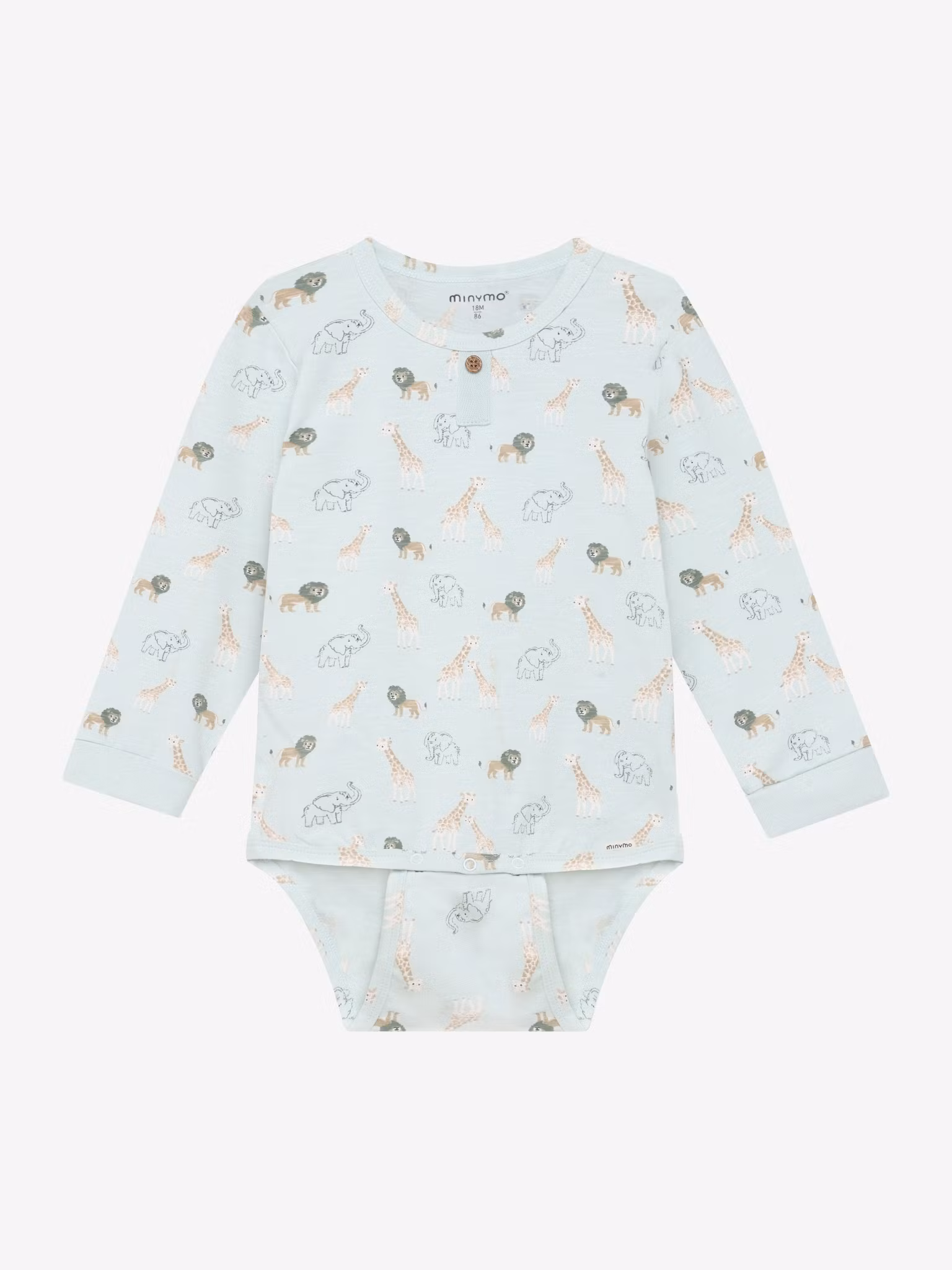 Body i en fin mintgrön färg, med safaridjur. passar fint med de mörkgröna sweatpantsen (lily pad) från minymoförlängningsbar både i grenen samt i armarna,märke: