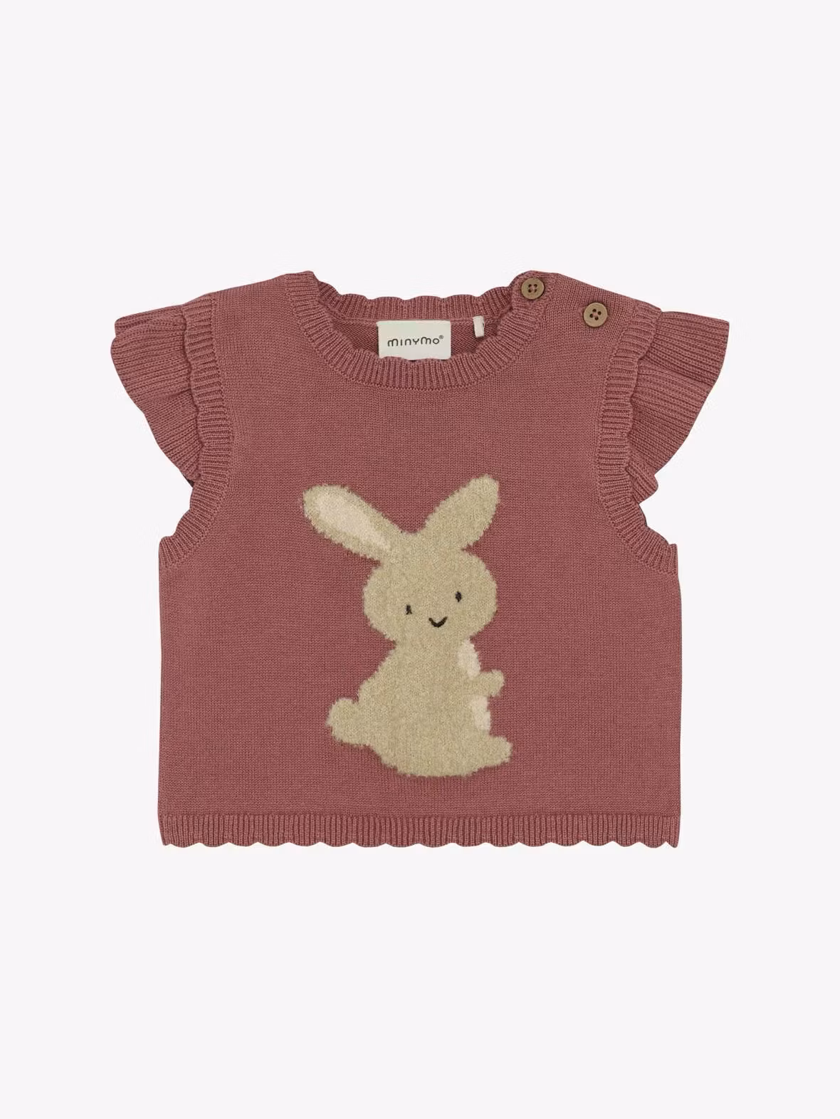 Otroligt söt kaninväst med volang vid axlarna, samt två knappar vid ena axeln.Märke: Minymo 90% bomull, 10% polyester