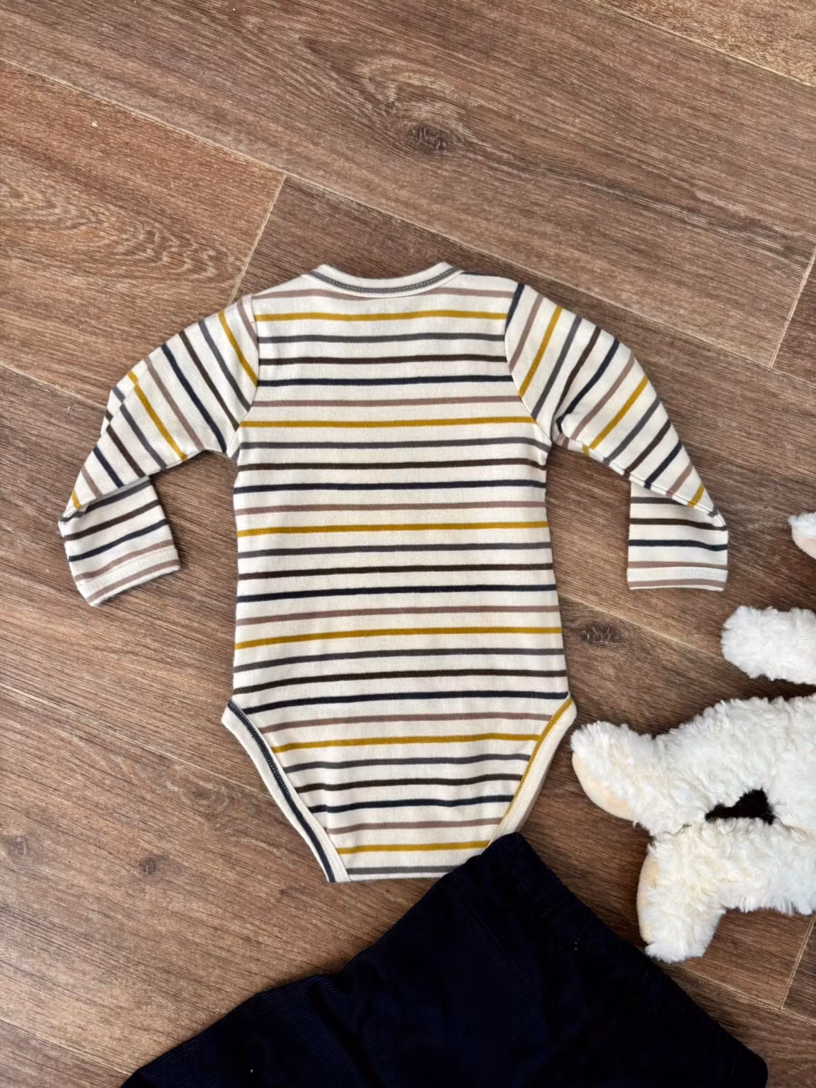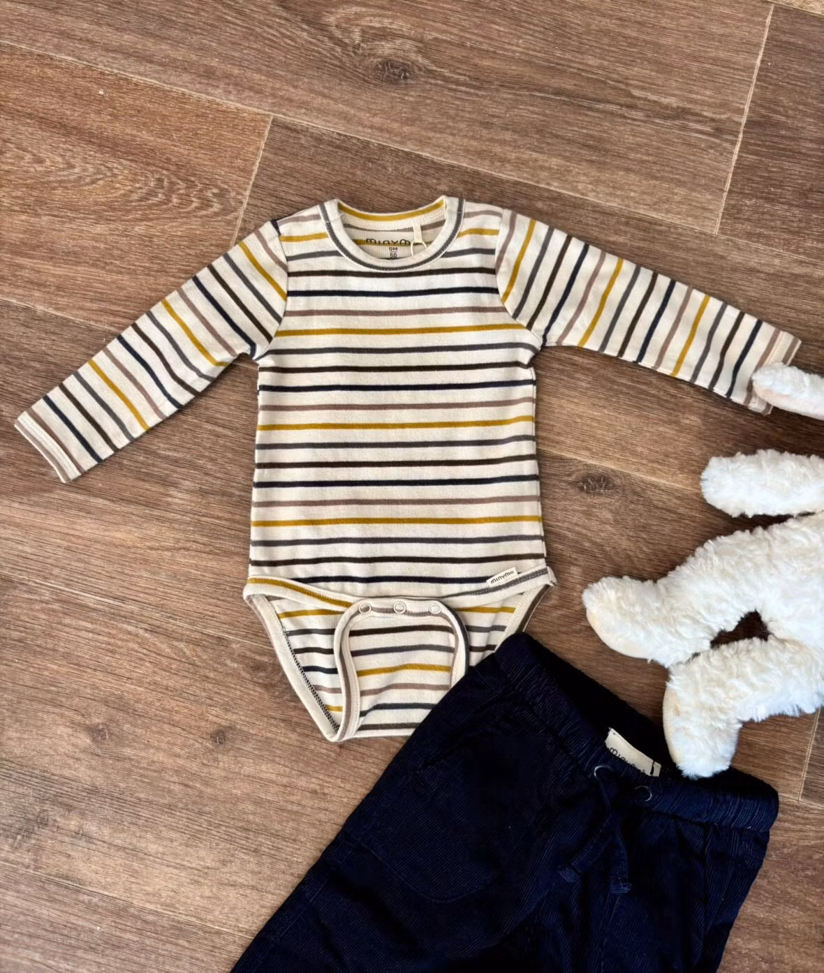 Randig body med mysiga färger, kommer från Minymo.Otroligt mjuk då den är gjord på 95% bomull och 5% elastan.
