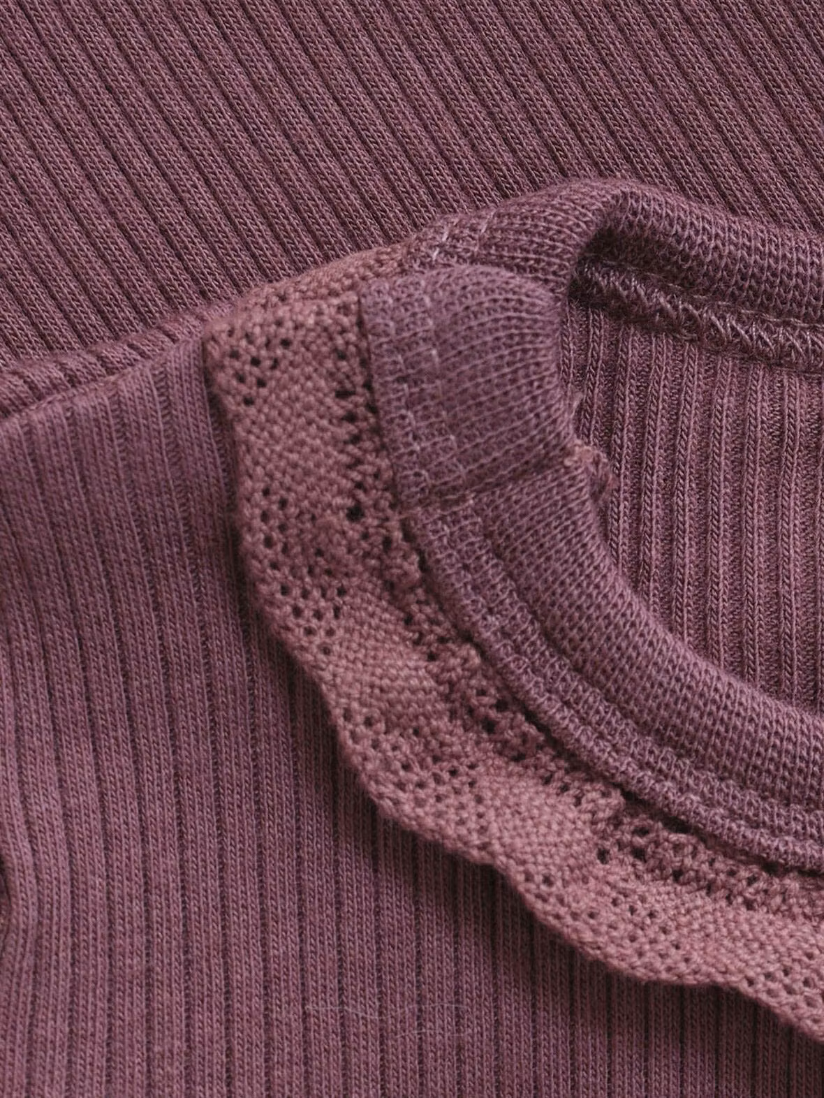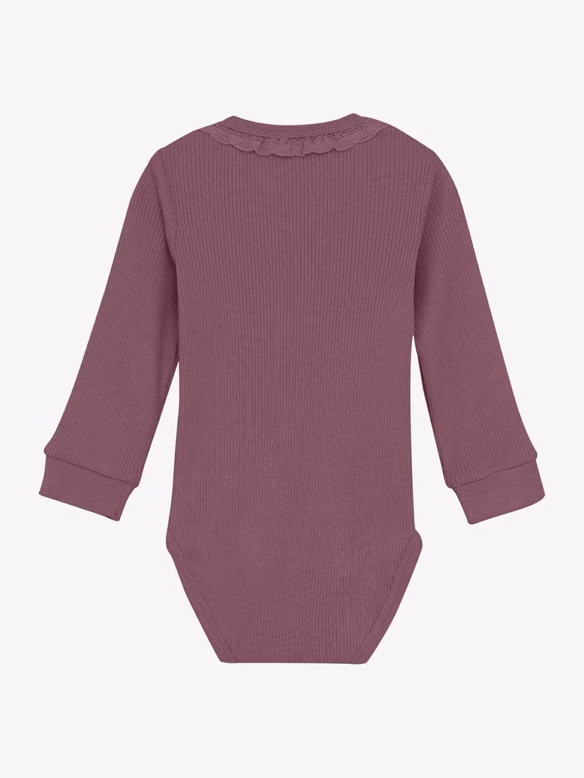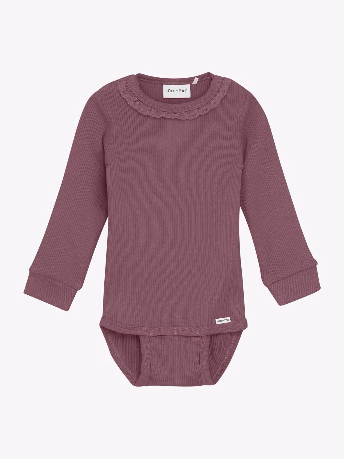 Ribbad body med söt spetskrage från Minymo.Förlängningsbar.Väldigt härlig färg och är i ett väldigt mjukt material.50% modal, 46% bomull, 4% elastan