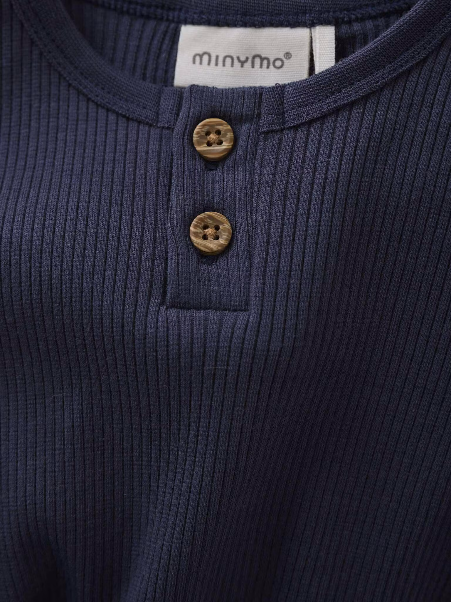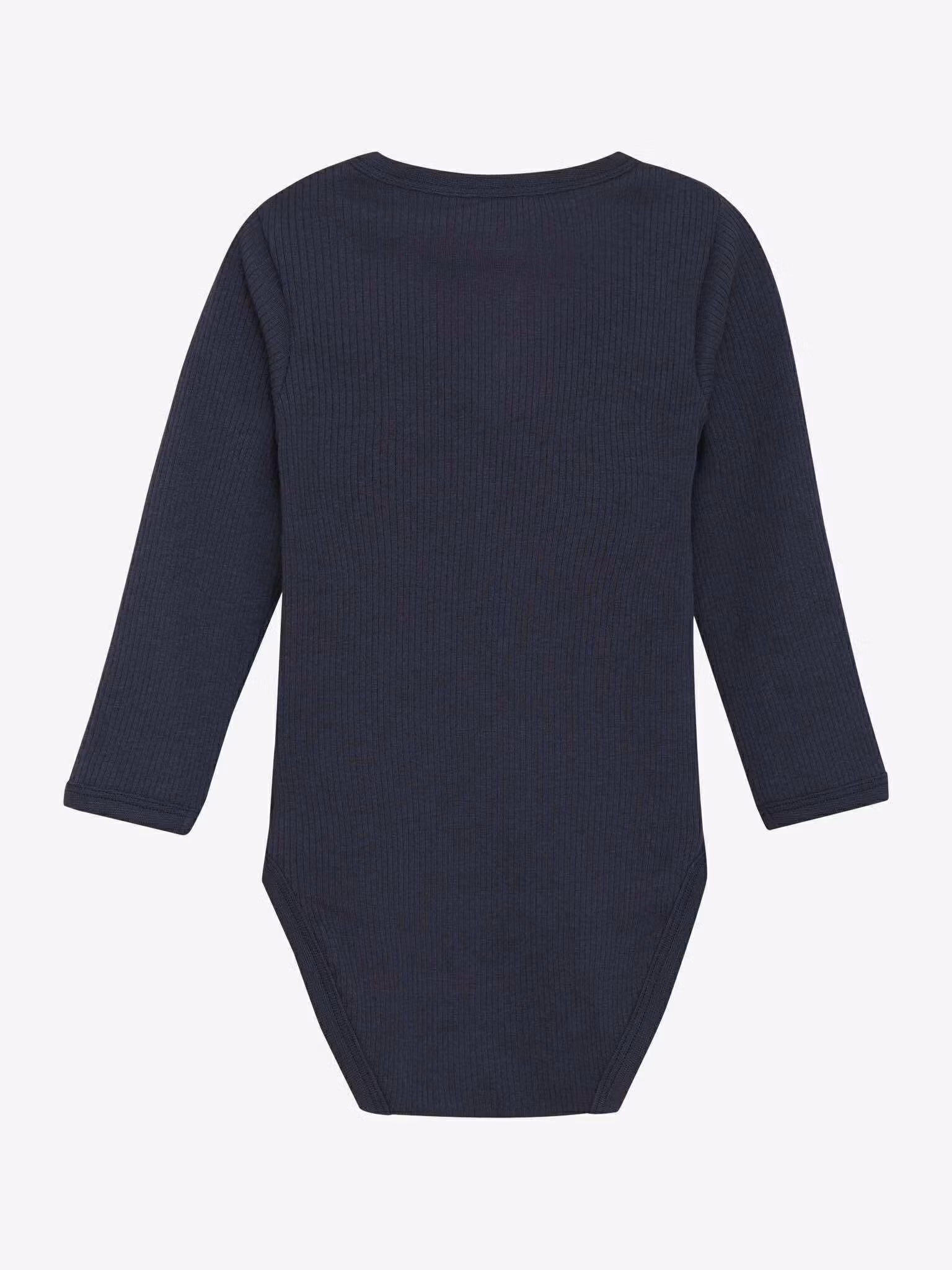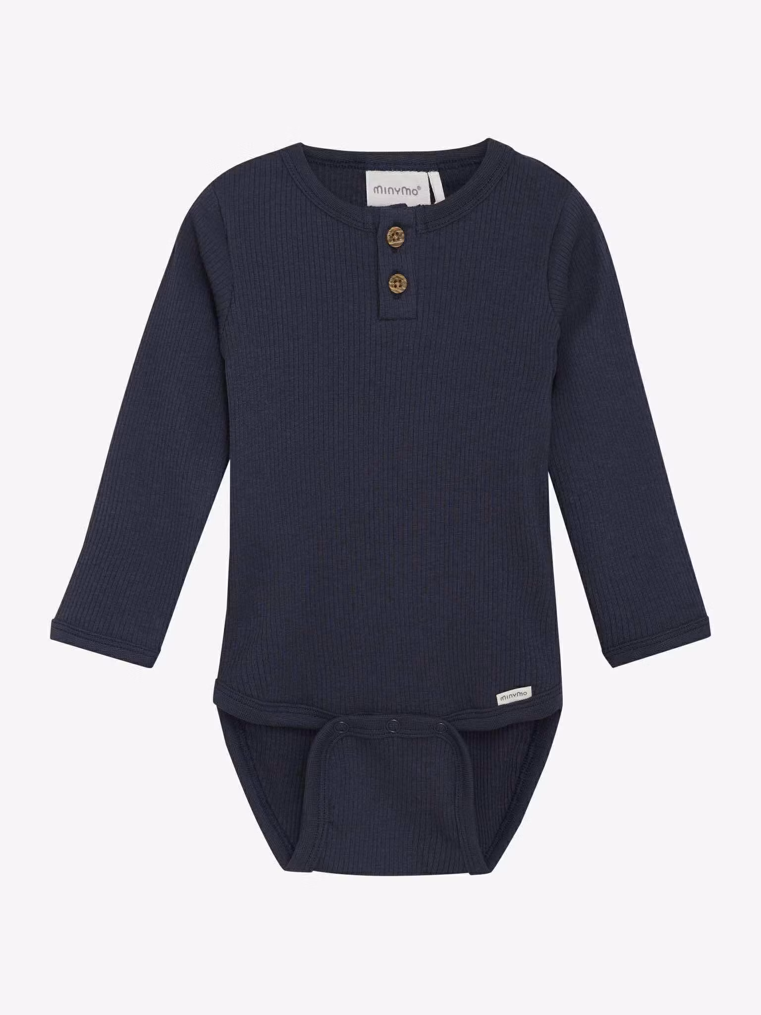 Ribbad mörkblå body.Märke: Minymo50% modal, 46% bomull, 4% elastan