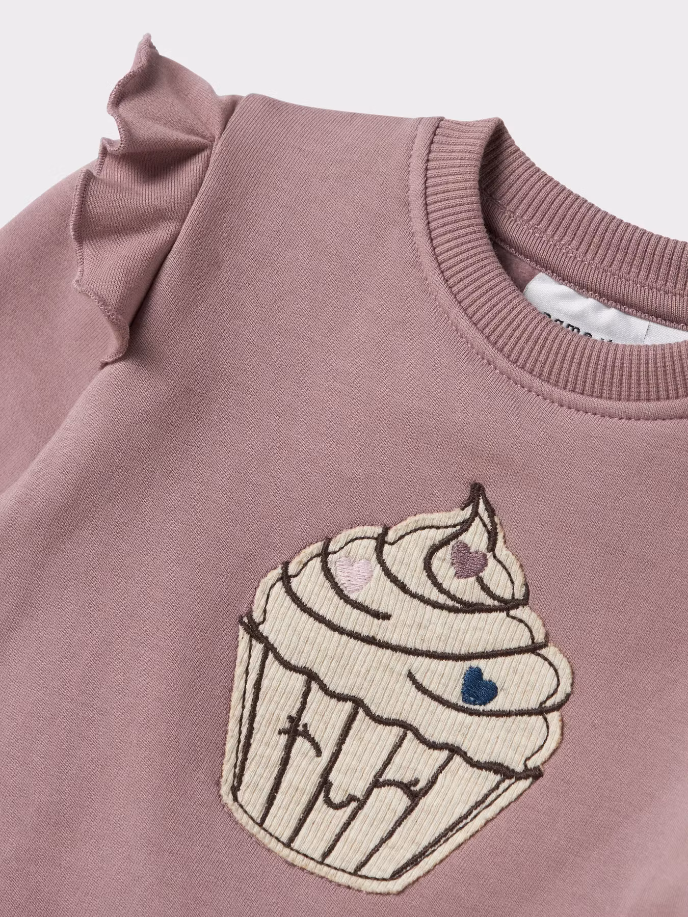 Fin sweatshirt med volangdetalj på axlarna och cupcake på magen.