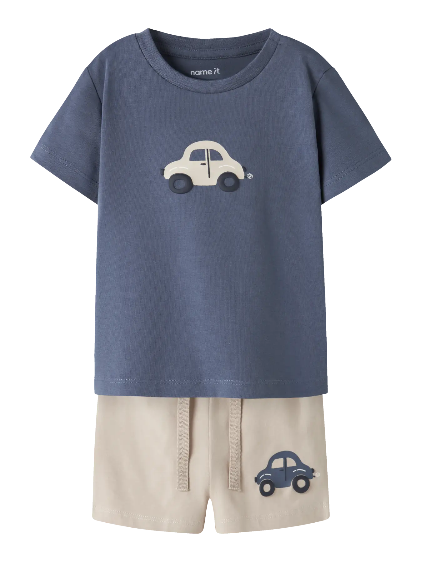 Set med både shorts och tshirt i beige och blått, med en bil som detalj.
