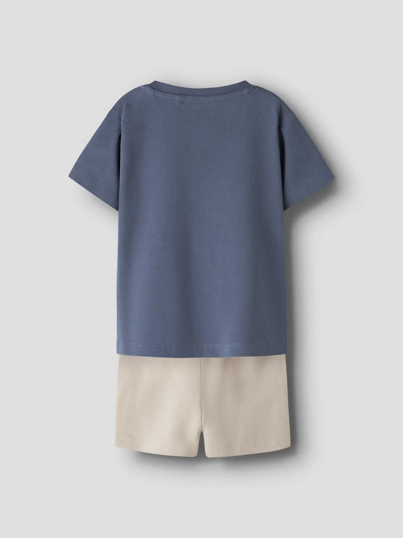 Set med både shorts och tshirt i beige och blått, med en bil som detalj.Märke: Name it 95% Bomull & 5 % Elastane