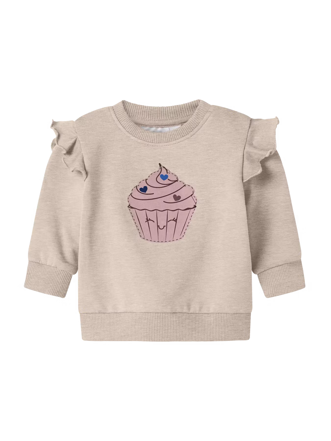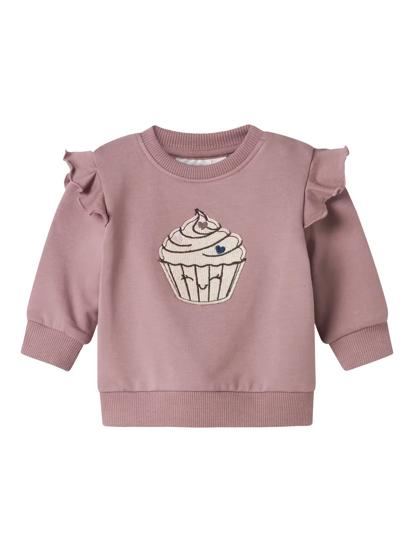 Fin sweatshirt med volangdetalj på axlarna och cupcake på magen.