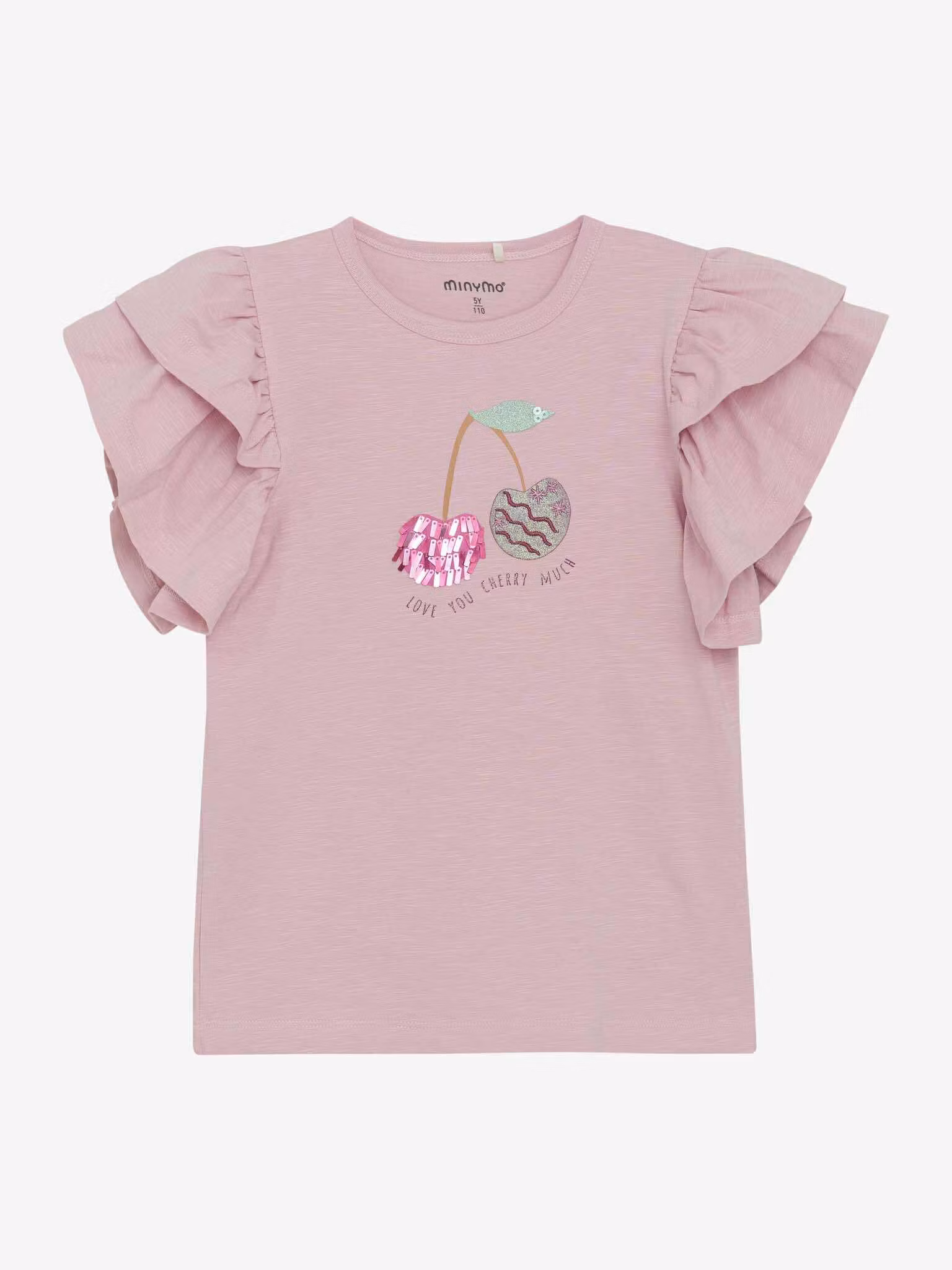 Fin T-shirt med volang på armarna och körsbärsmotiv.Märke: Minymo95% bomull, 5% elastan