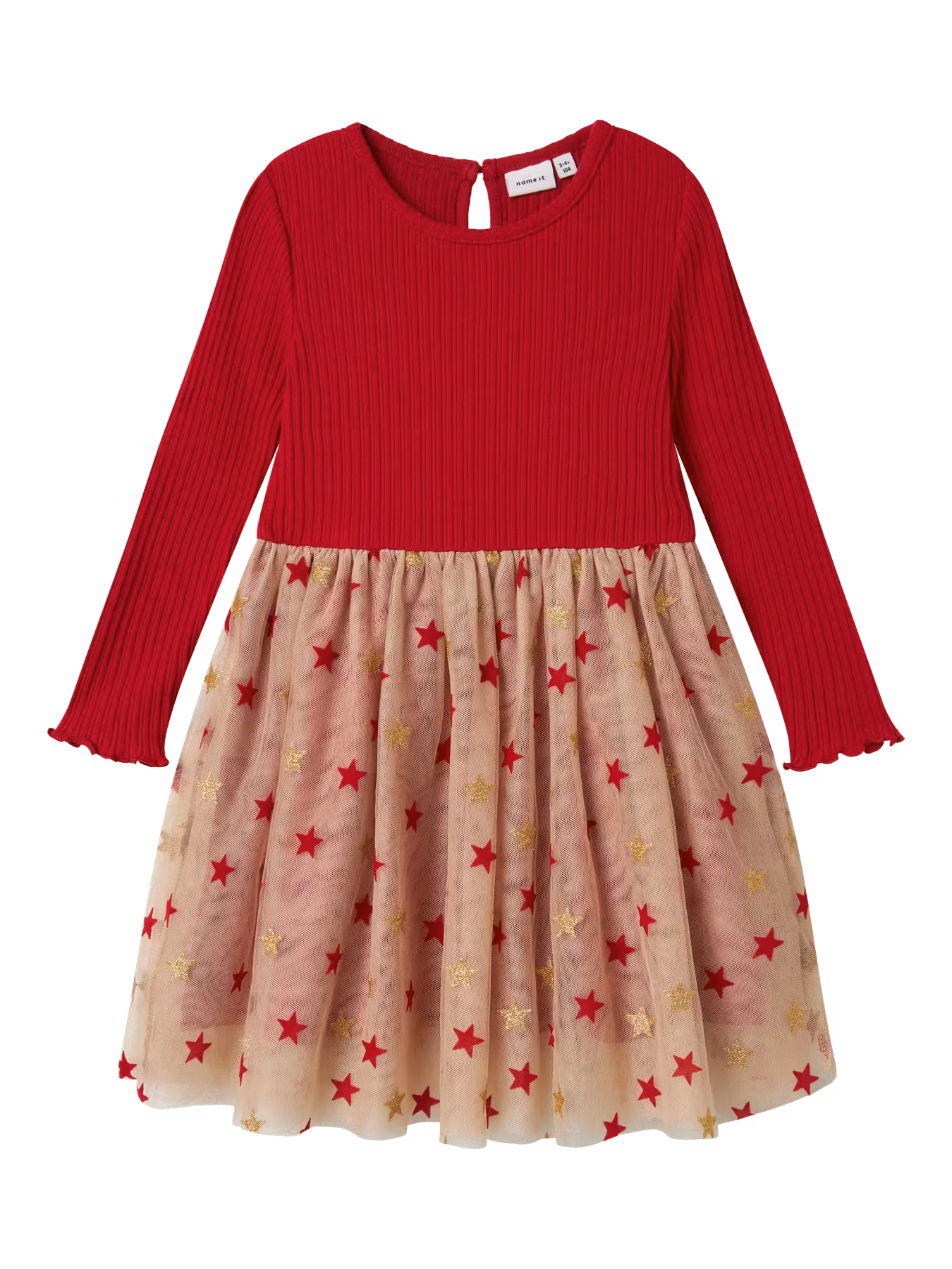 Fin julklänning som är ribbad upptid och med tyllkjol i mesh nedtill. Dekorativa stjärnor i tyllen som glittrar upp julen. Stjärnorna är i både rött och guld.