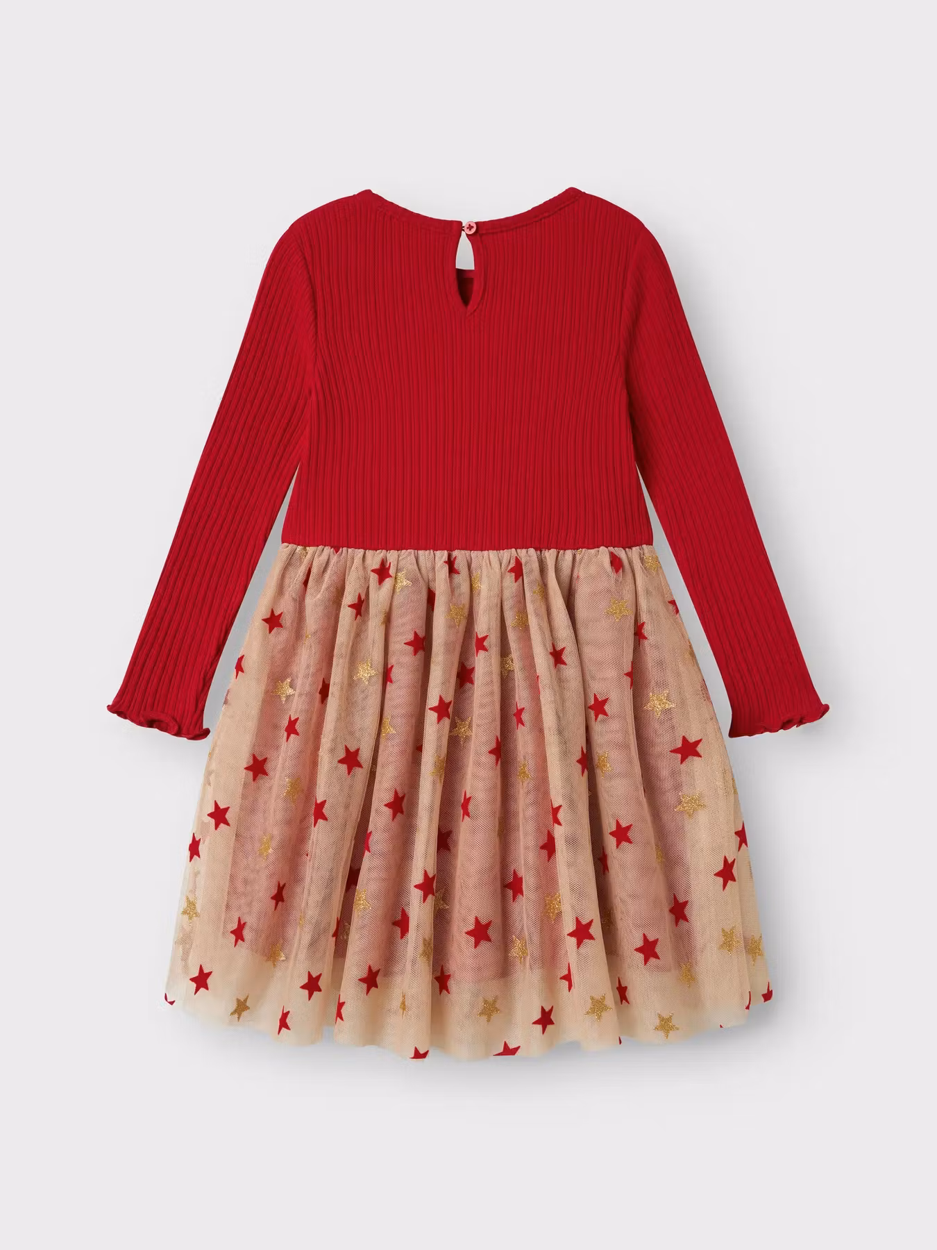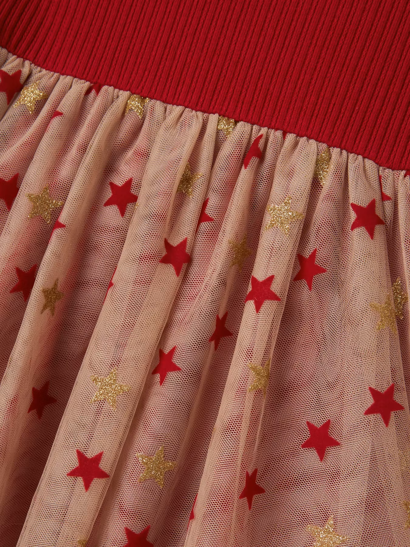 Fin julklänning som är ribbad upptid och med tyllkjol i mesh nedtill. Dekorativa stjärnor i tyllen som glittrar upp julen. Stjärnorna är i både rött och guld.&n