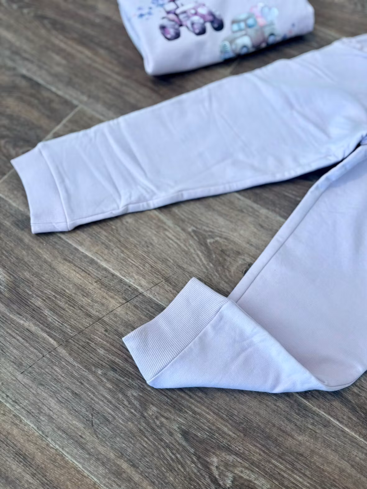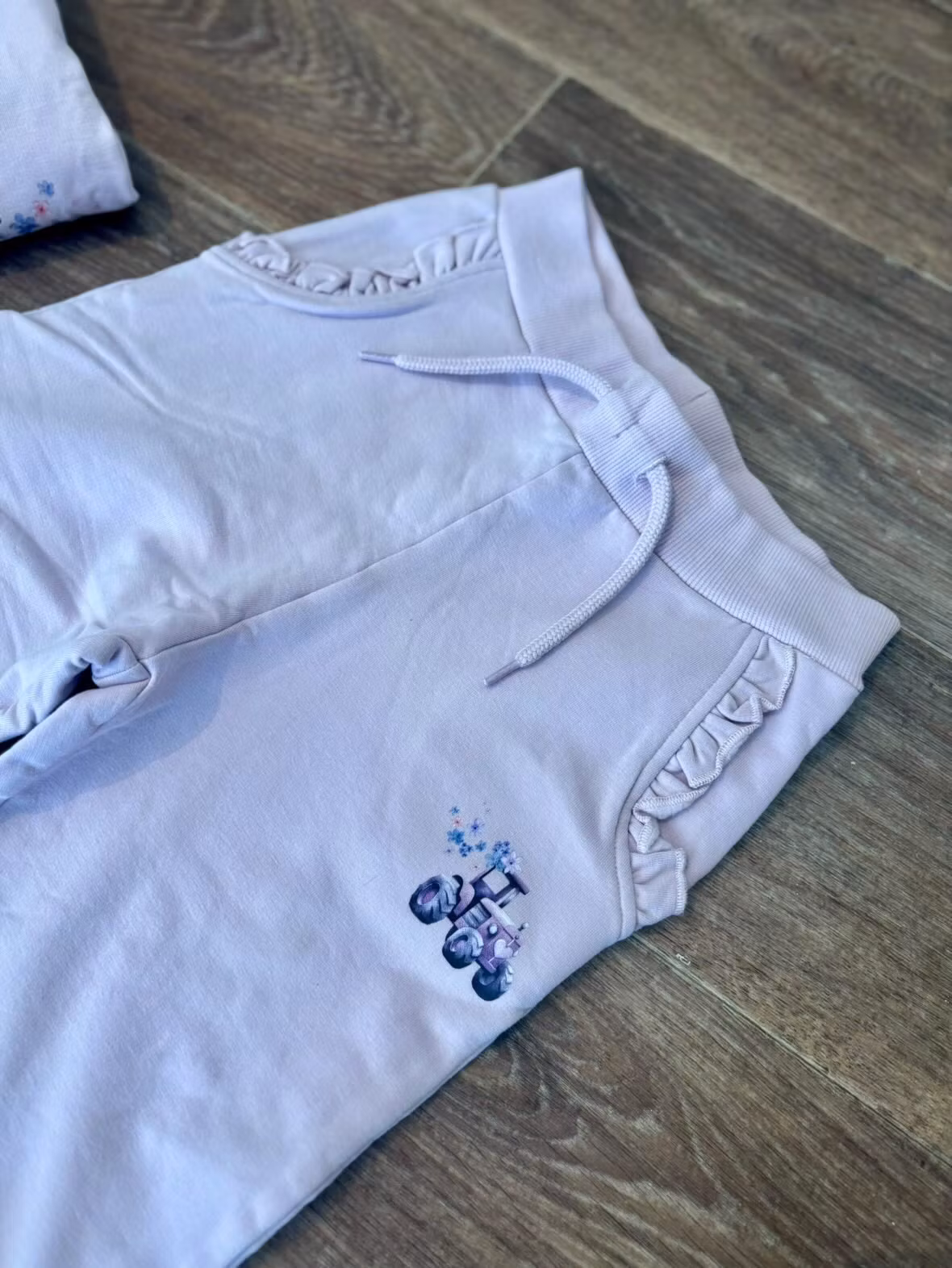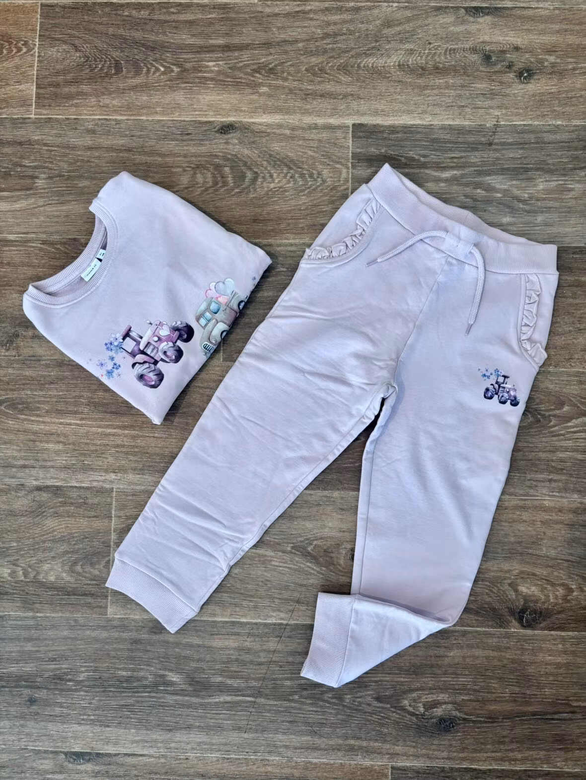 Otroligt söt joggingbyxa i härligt ljusrosa färg.Söta volanger vid fickorna och med ett litet print på en traktor.Mycket mjuka och sköna att bära.Kommer från mä