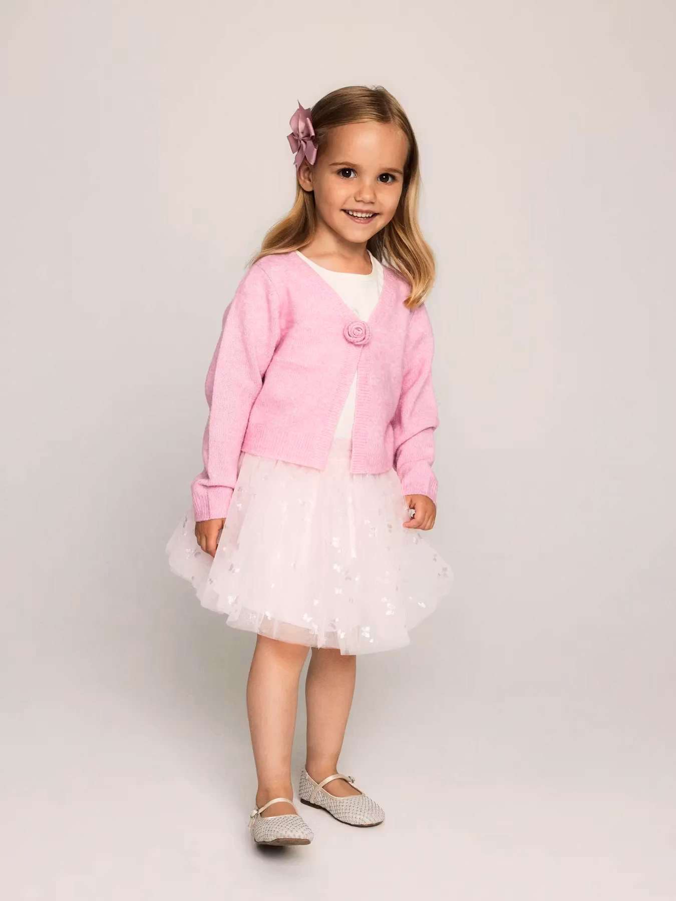 Vacker rosa kofta med rosdetalj.