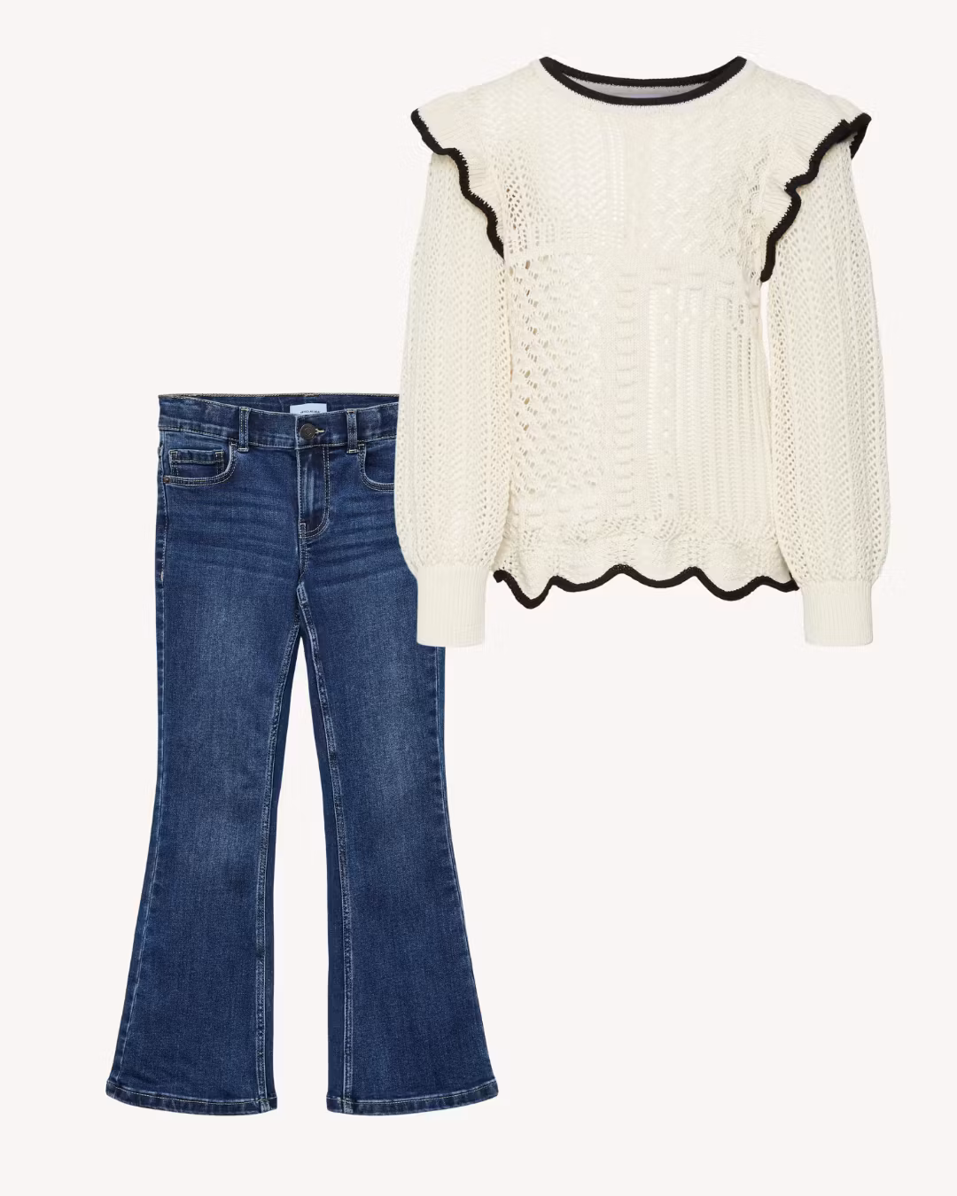 Klassisk jeans med bootcutHålstickad tröja med volang detaljer