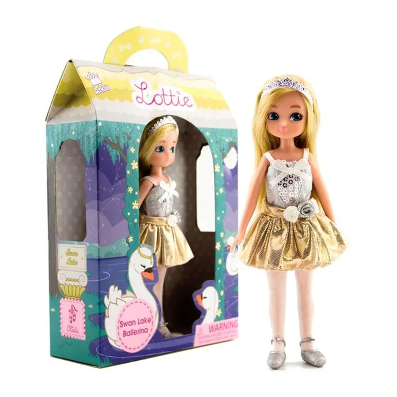 Lottie älskar att dansa balett och nu får hon vara med på säsongens stora uppsättning av Svansjön! Därför har hon nu fått extra fina balettkläder i silver och guld med paljetter, rosor och rosetter som dekoration, nästan genomskinliga vita strumpbyxor, balettskor i silver och en vacker och gnistrande tiara för speciella uppträdanden. Denna Lottie har blå ögon, ljust skinn och långt blont hår som går att sätta upp i snygga frisyrer. Den 18 cm höga dockan kan stå av sig själv, och utformades utifrån proportionerna på 9-åriga tjejer. Armar och ben kan vridas och riktas som man vill, och knäna går att böja försiktigt till tre olika positioner. Kläderna går att ta av och passar till alla andra dockor i Lottie-serien.