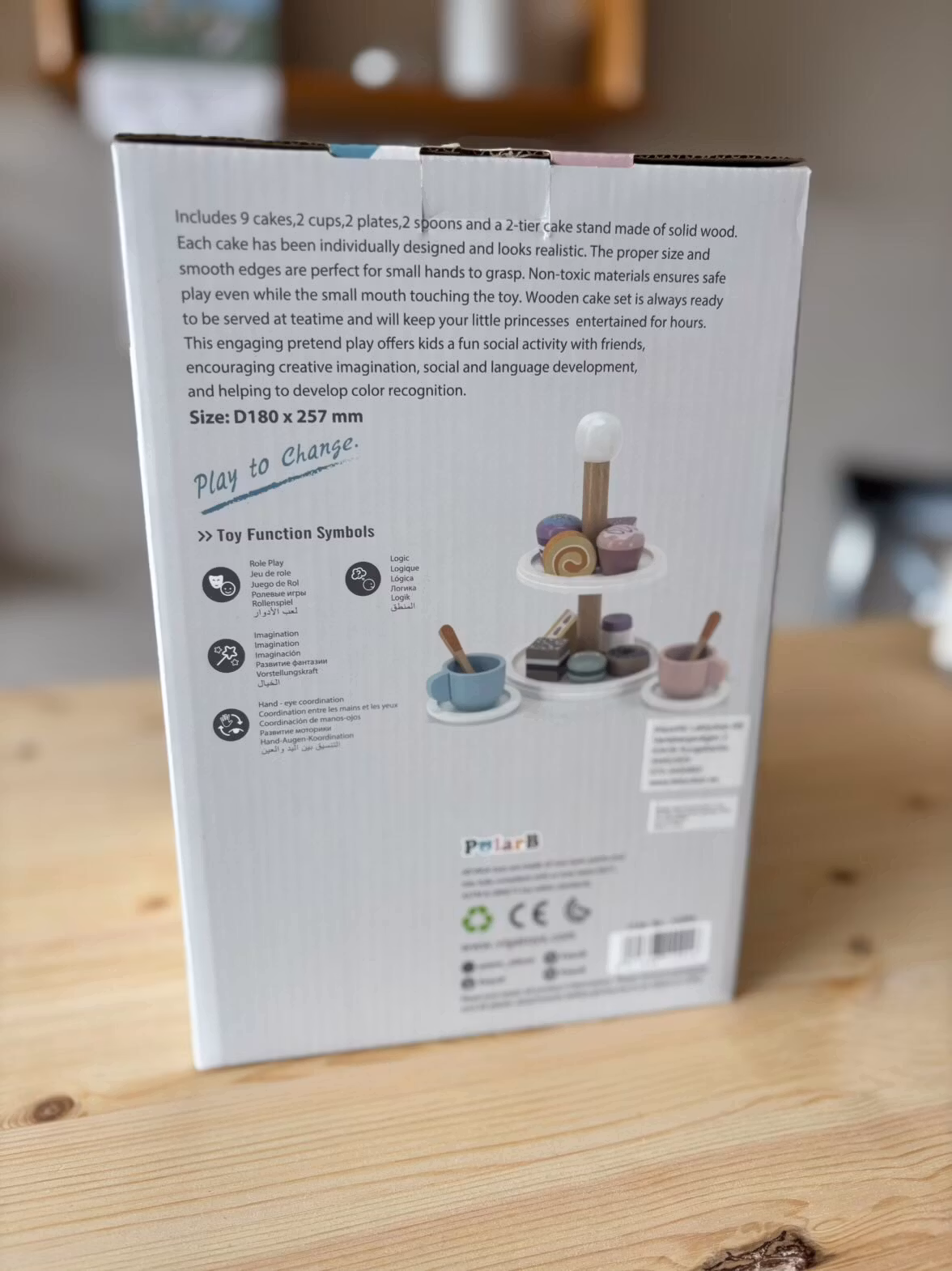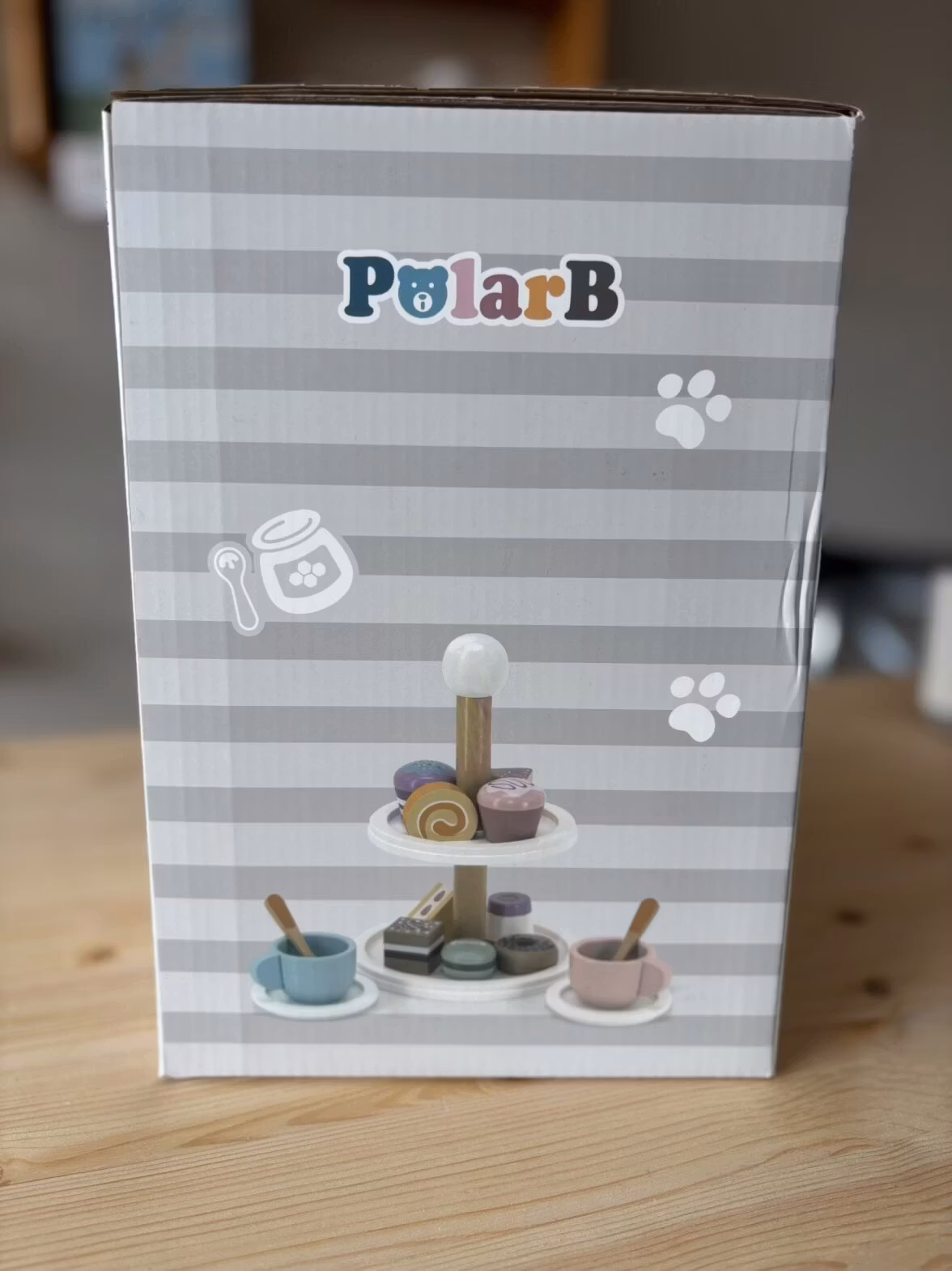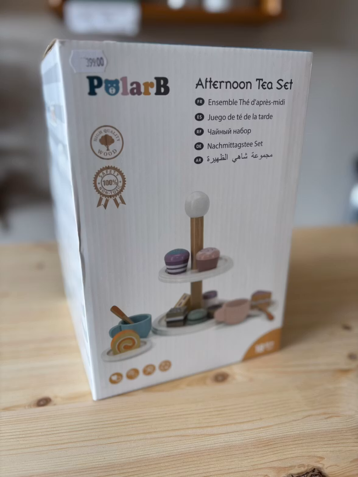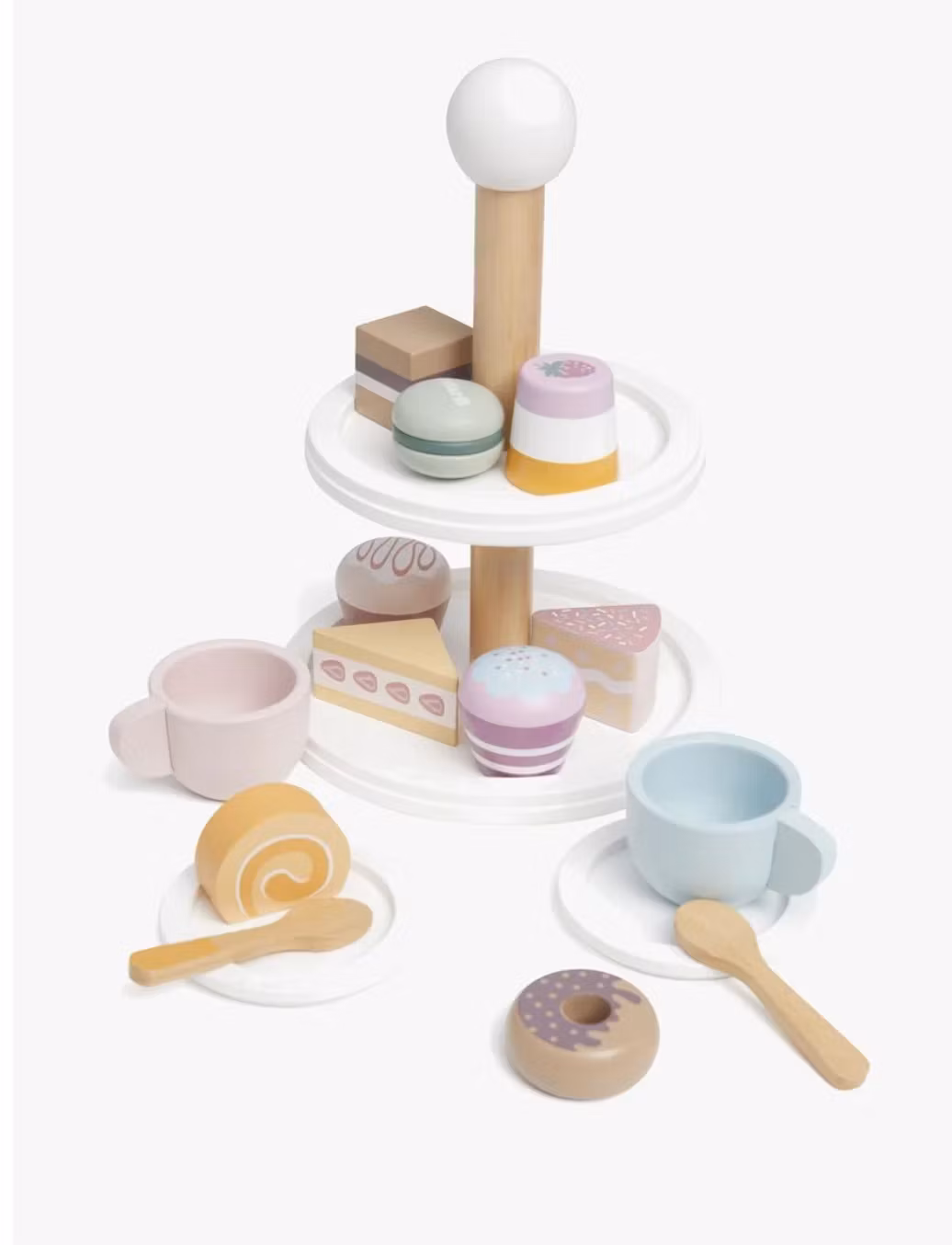 Supergulligt te-set i trä, från PolarB.Innehållande 9 kakor, 2 koppar, 2 tallrikar, 2 skedar och ett tvåvåningsfat.Perfekt för barnet som älskar att leka och le