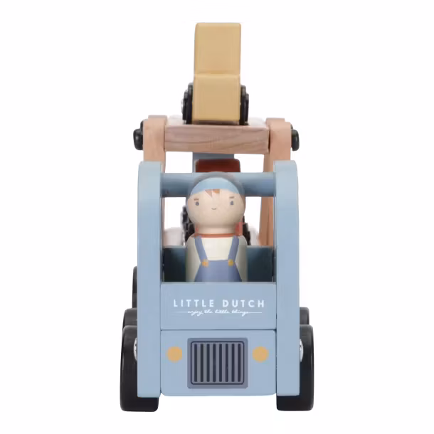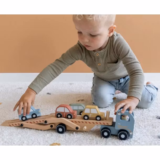 Den lilla trälastbilen med släpvagn – inklusive 4 bilar och en figur – kommer garanterat att fånga din lillas uppmärksamhet när den kör förbi! Fäll ut släpvagnen så kan bilarna köras på och av. Den lilla lastbilen kommer garanterat att ge timmar av underhållning och är ett utmärkt tillskott till vilken bilsamling som helst hemma.