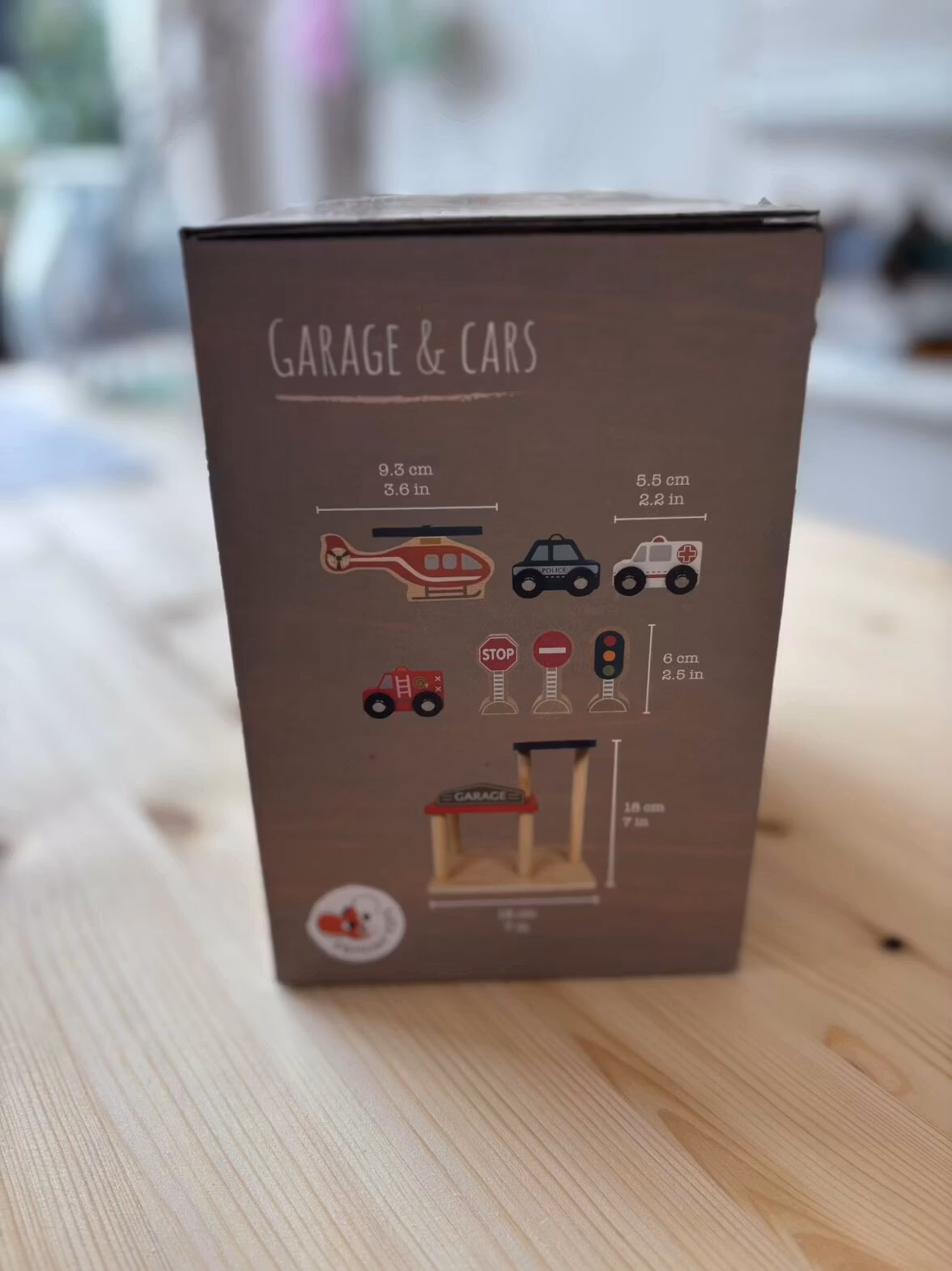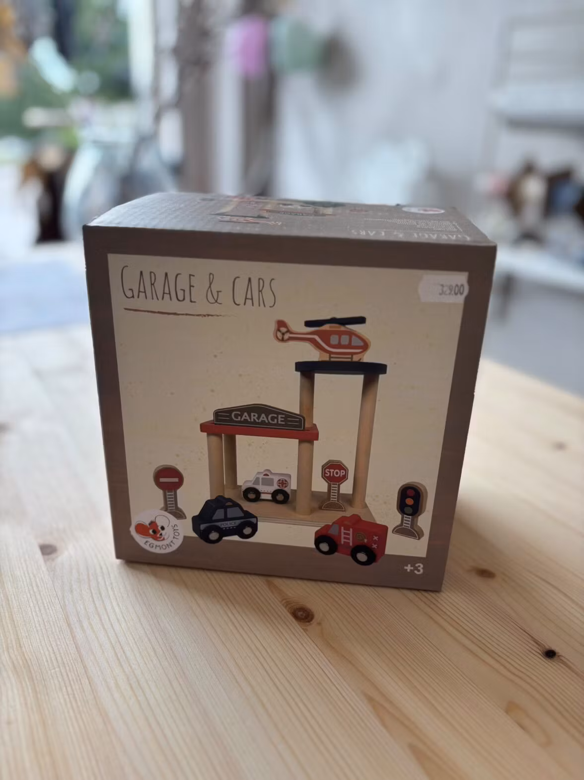 Gulligt litet garage med tillhörande fordon och skyltar.Perfekt som present!Funkar lika bra som en rolig leksak för de små som en trevlig inredningsdetalj i bar