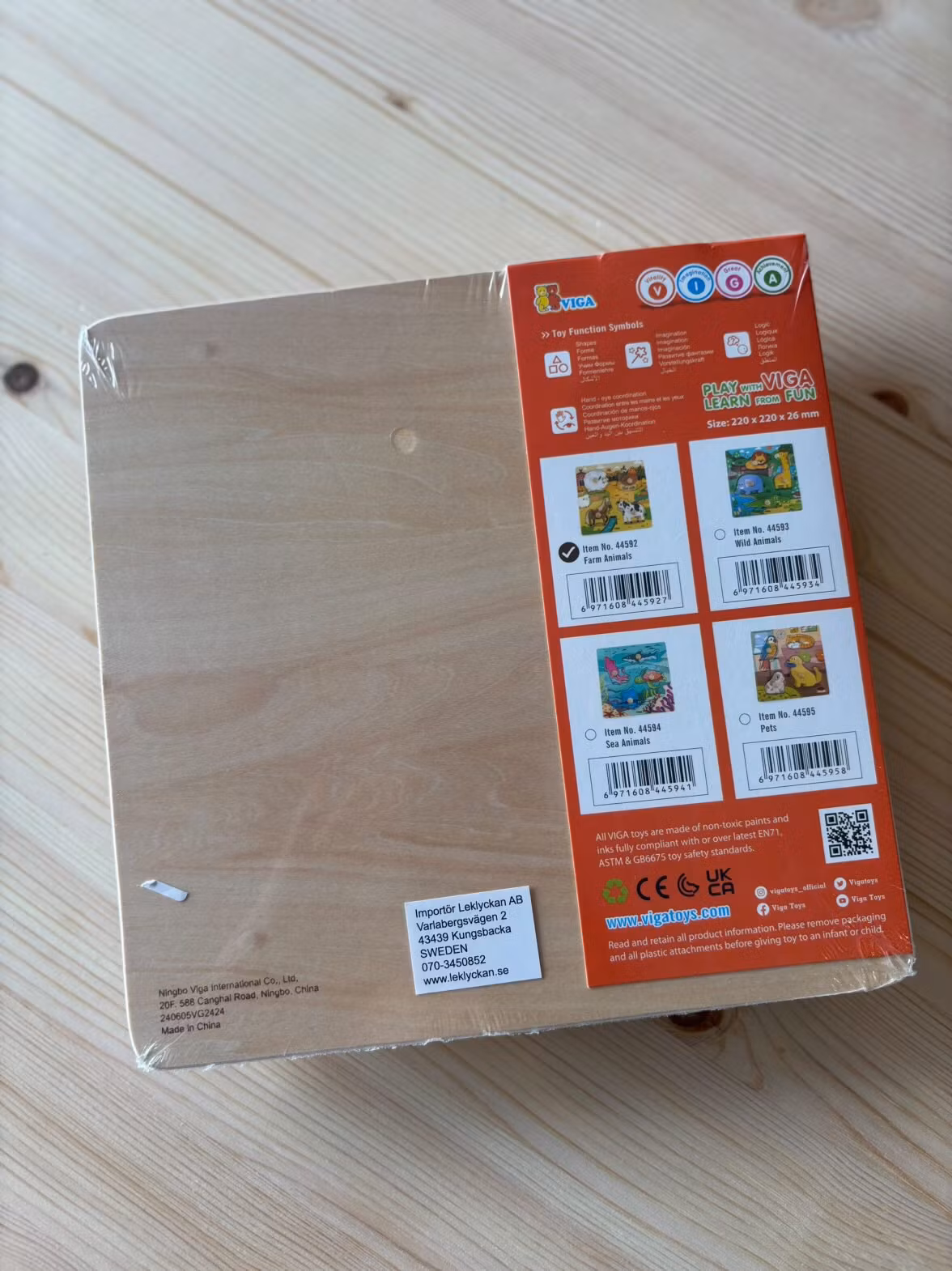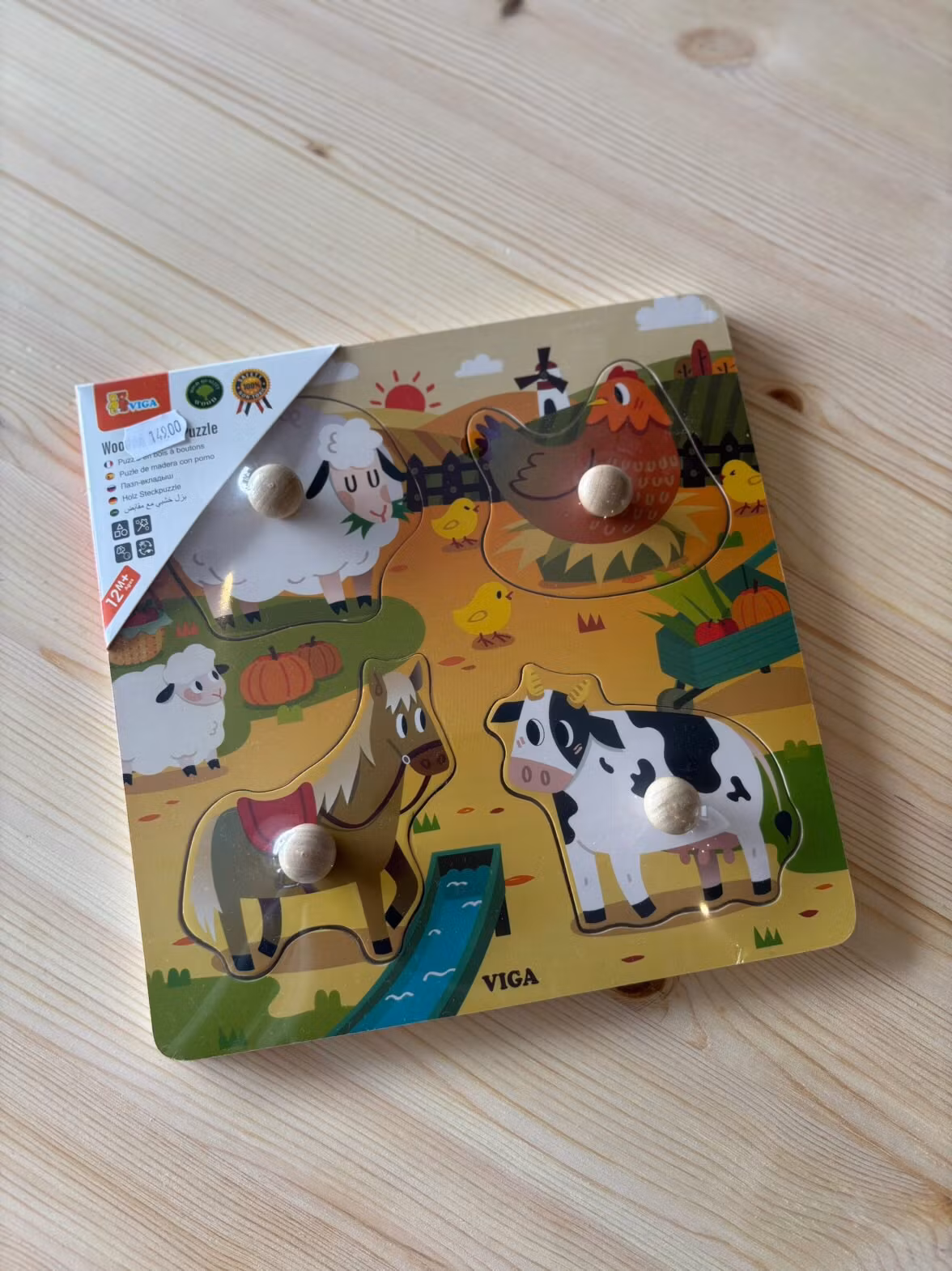 Gulligt pussel med knoppar från VIGA.Lätt för de små händerna att hålla i.Bra läge att tillsammans även prata om de olika bondgårdsdjuren.