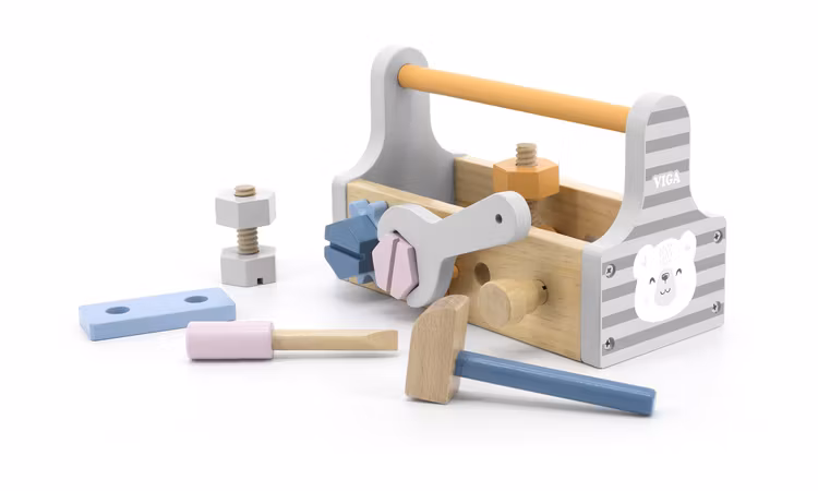 Verktygslåda med tillhörande verktyg i trä.Storlek: 200*125*90mmÅlder: 3+