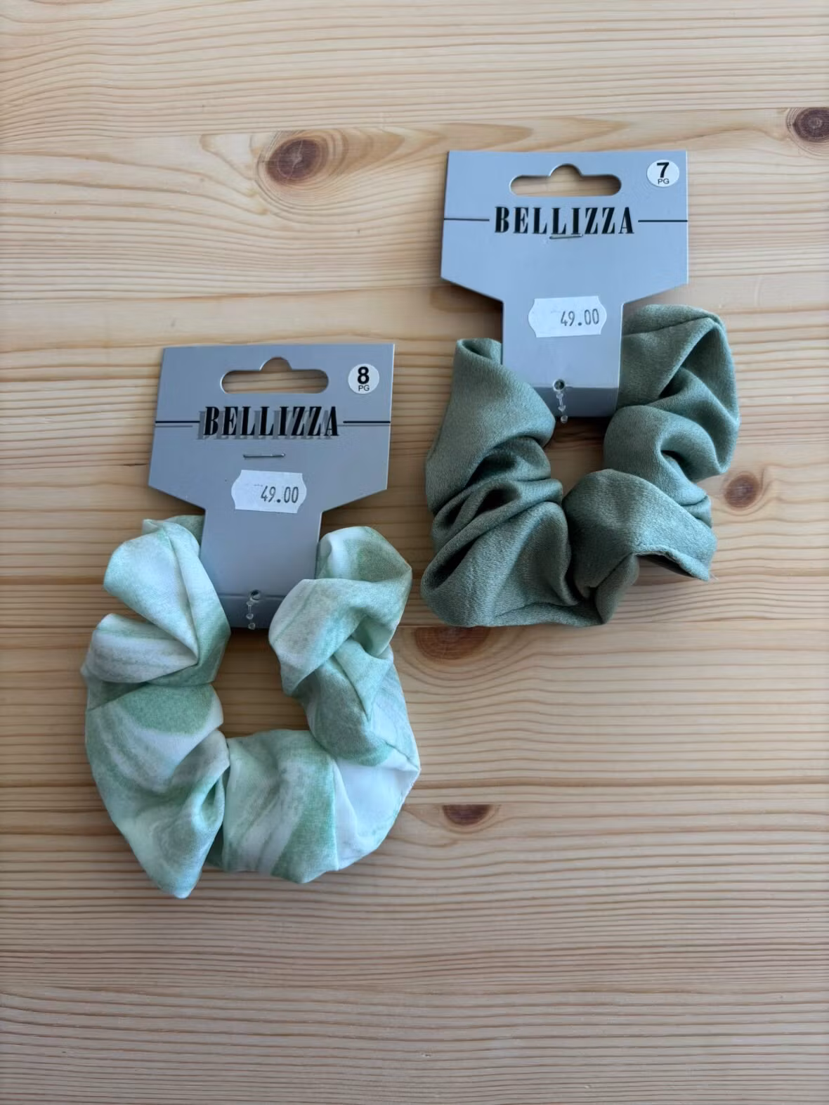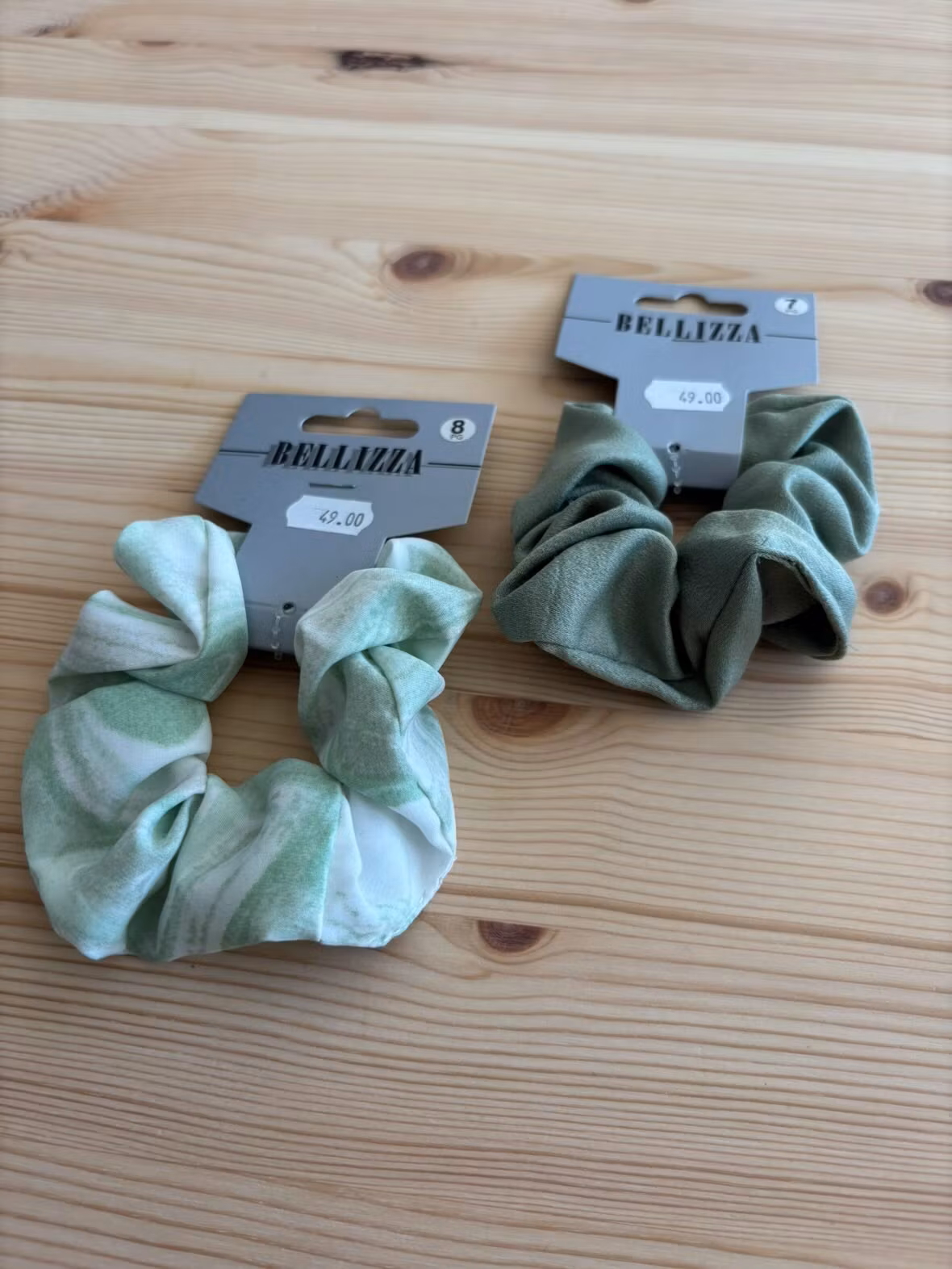 Mycket fina scrunchies i två olika gröna varianter.Piffar till frisyren på ett kick. Den är elastisk och passar hästsvansar, hairbuns, flätor mm.