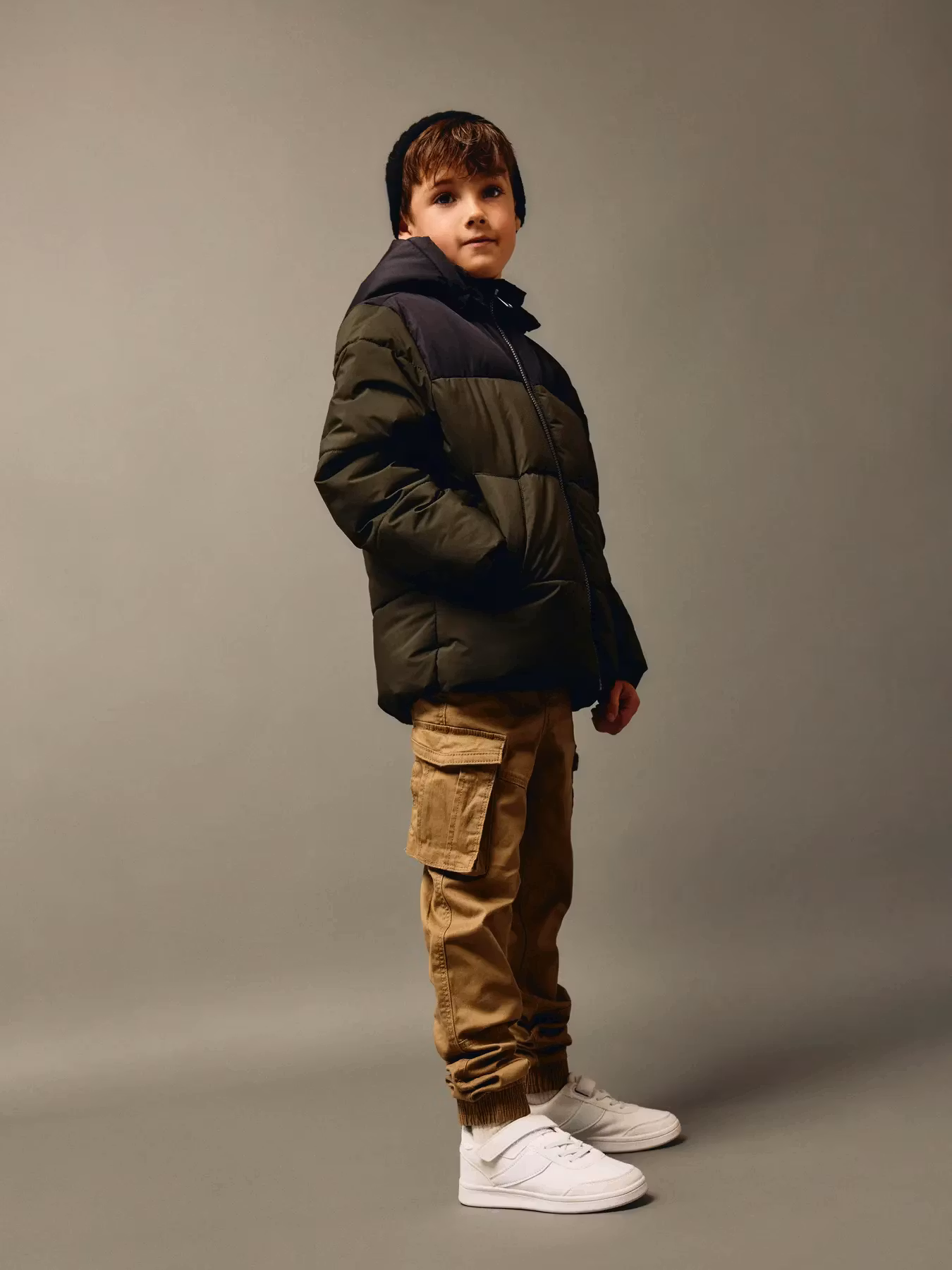 Puffer vinterjacka, med avtagbar huva. Reflexdetalj baktill, muddar i armslutet.