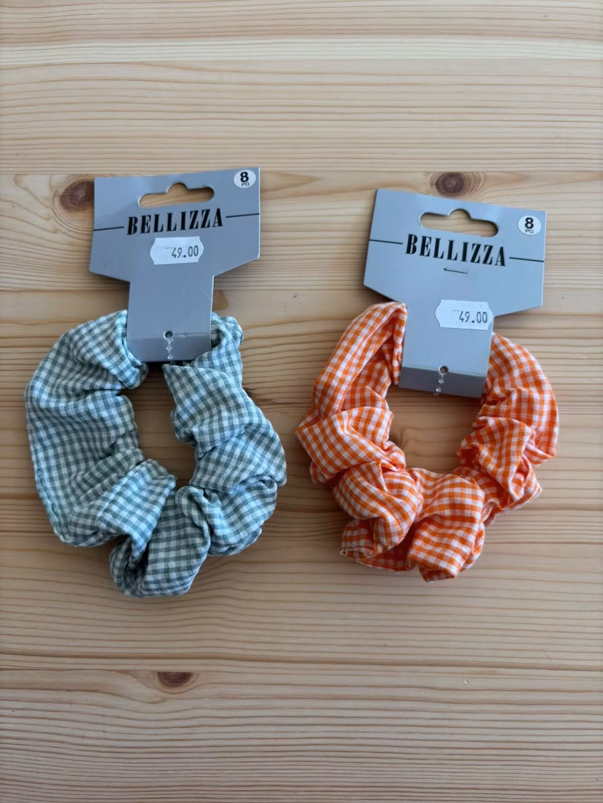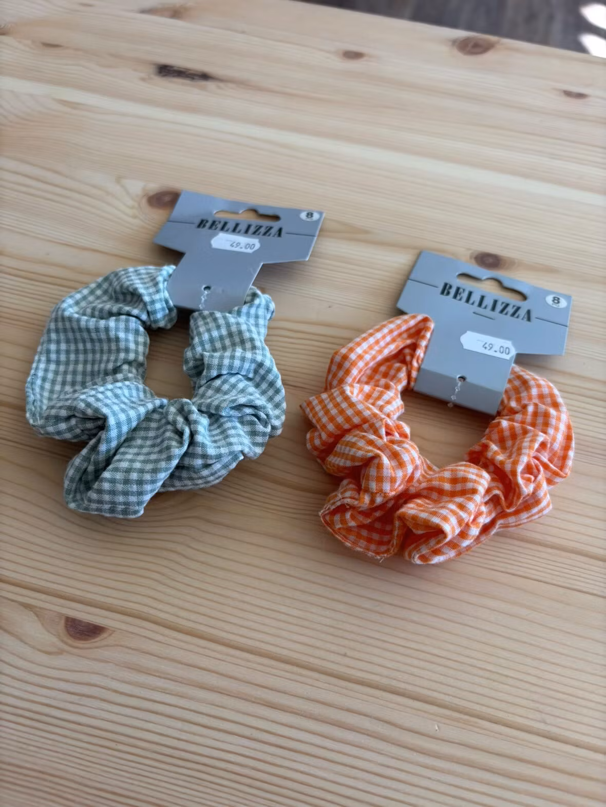 Rutig scrunchie i grön/vit eller orange/vit.Piffar till frisyren på ett kick. Den är elastisk och passar hästsvansar, hairbuns, flätor mm.