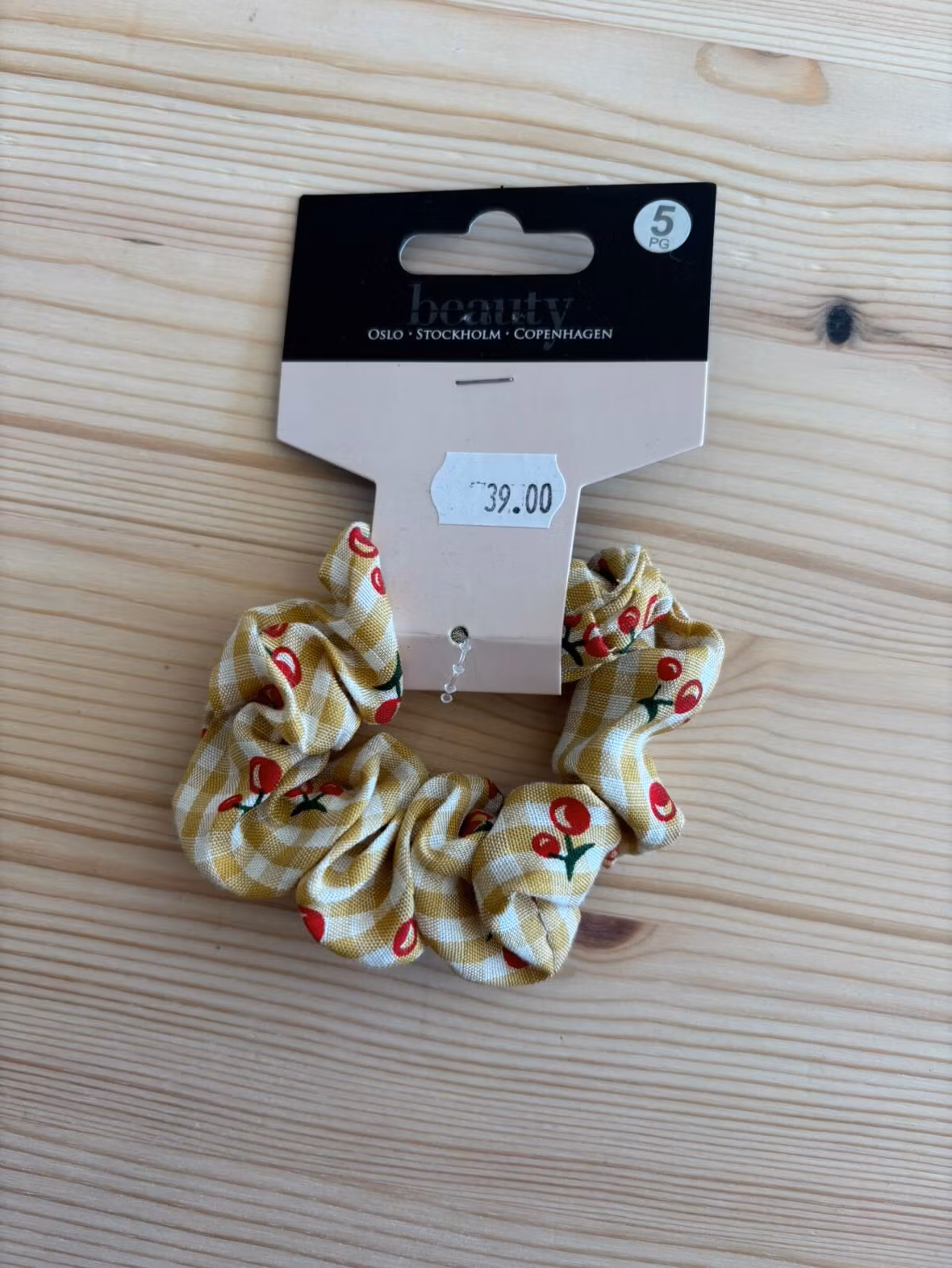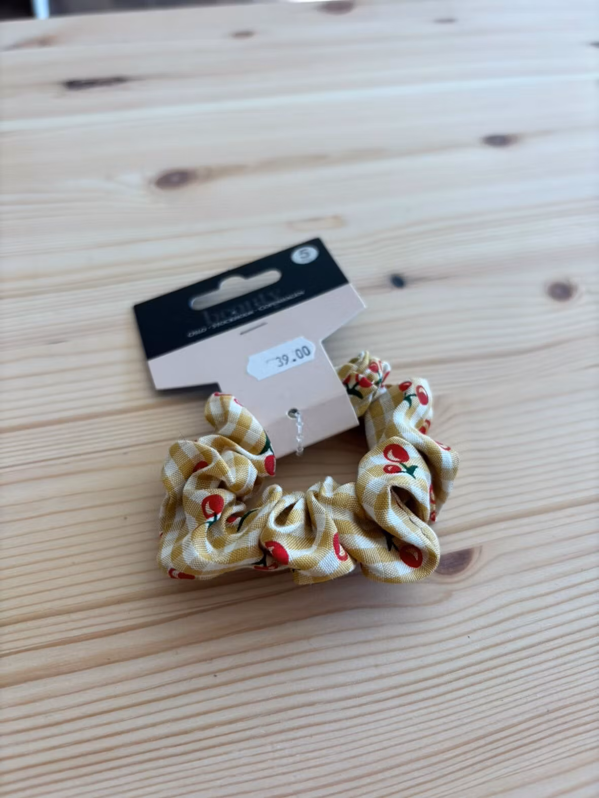Vit och gul rutig scrunchie med körsbär på.Piffar till frisyren på ett kick. Den är elastisk och passar hästsvansar, hairbuns, flätor mm.
