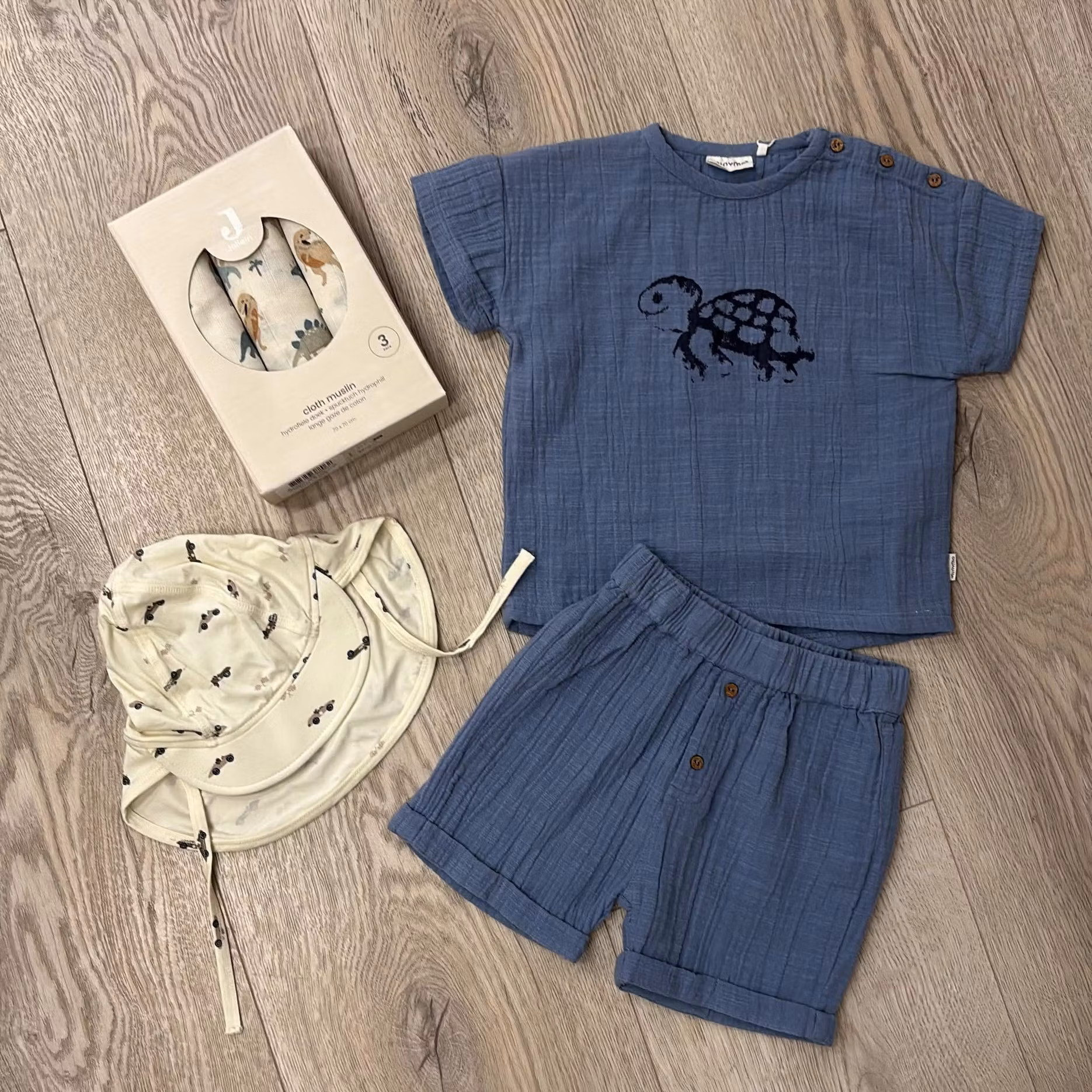 Set med tshirt & shorts i muslin, med sköldpadda och fina träknappar.