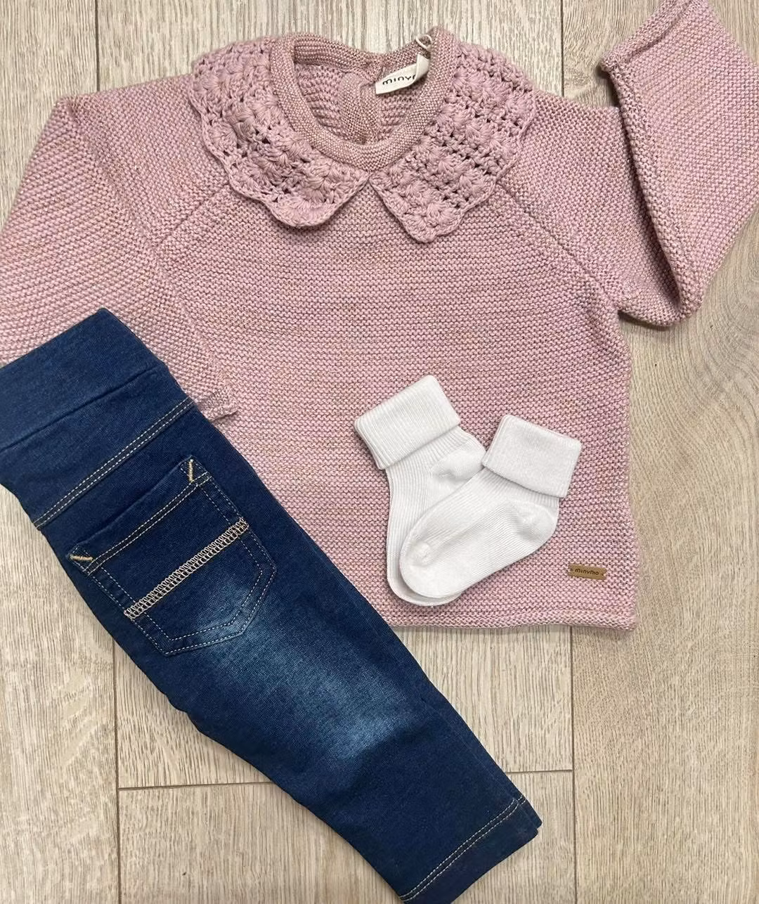 Stickad ros tröja med glitter i sig. Fin krage.Märke: Minymo85% bomull, 15% metalfiber