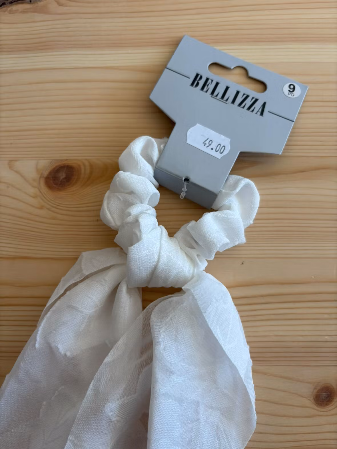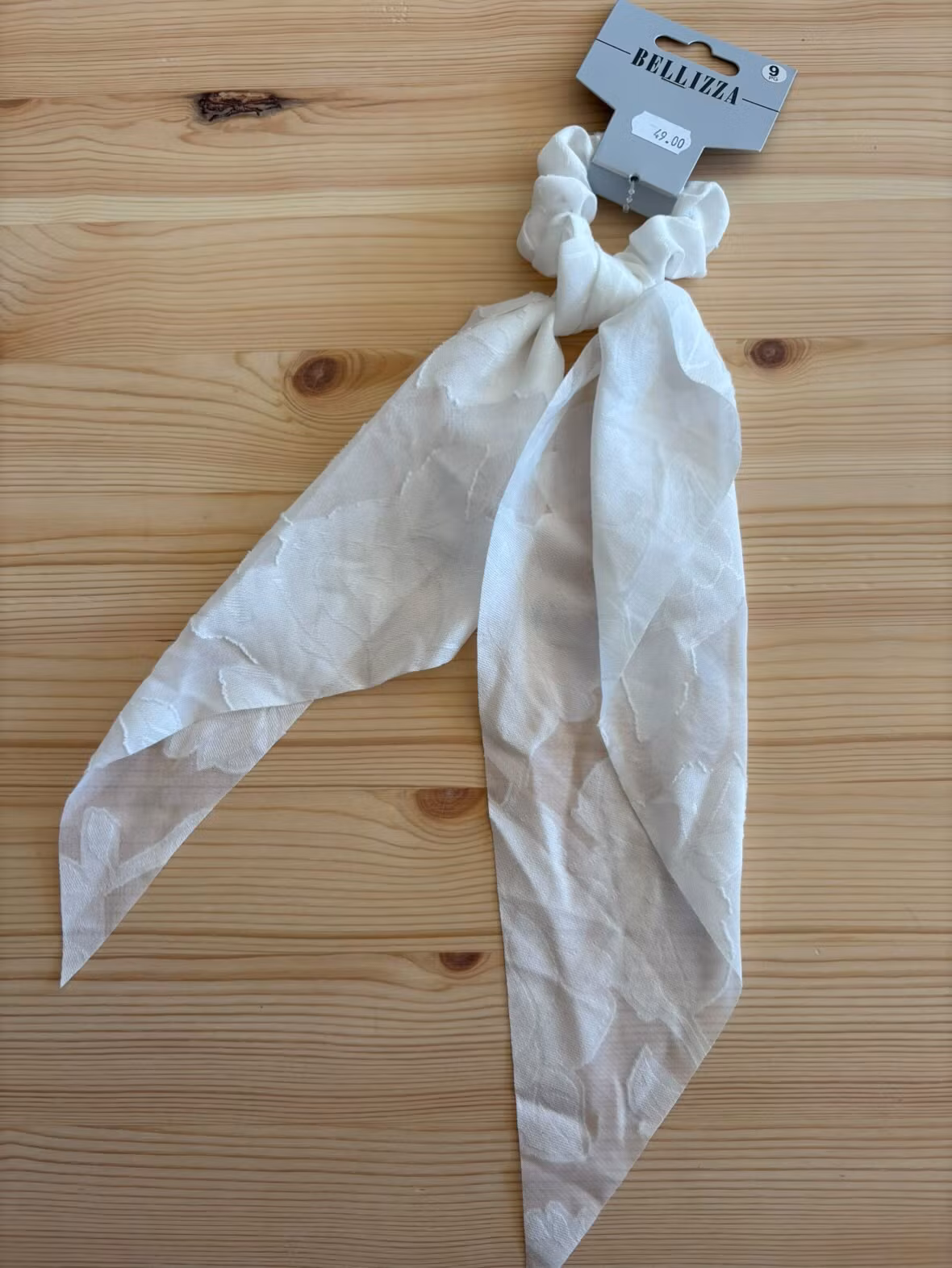 Vacker scrunchie med band av vitt tunnt Tyg.Piffar till frisyren på ett kick. Den är elastisk och passar hästsvansar, hairbuns, flätor mm.