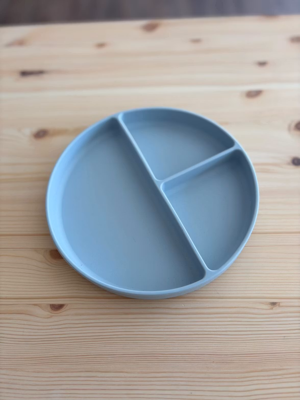 Enkel och fin tallrik från Whally. Gjord av 100% silikon och har tre olika fack, vilket är perfekt om man vill dela upp maten på tallriken. Produkten har också en sugpropp på undersidan vilket gör att den står stadigt och bra på bordet när barnet äter.