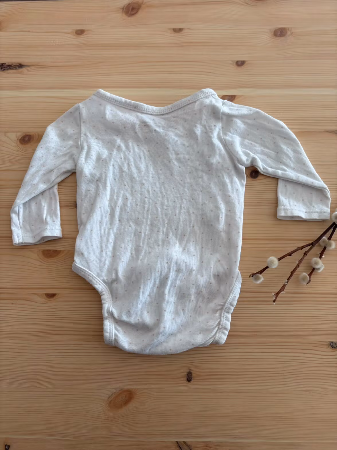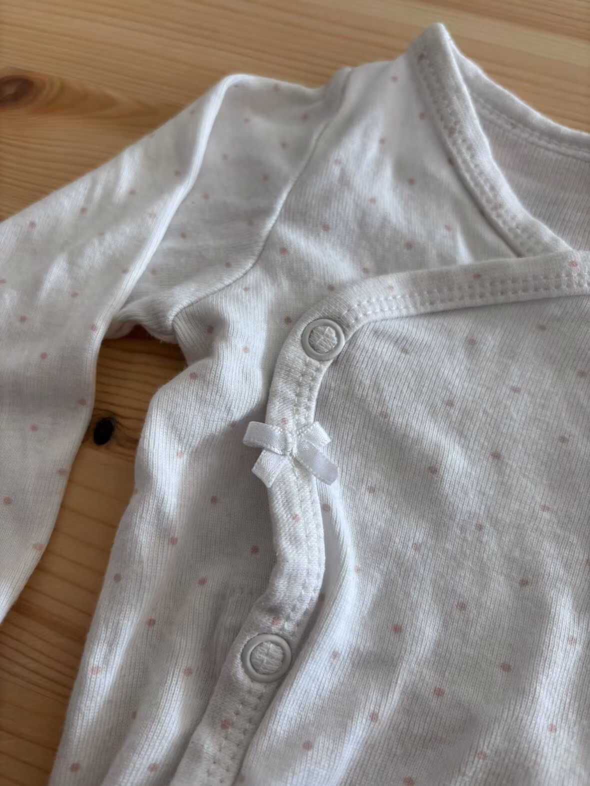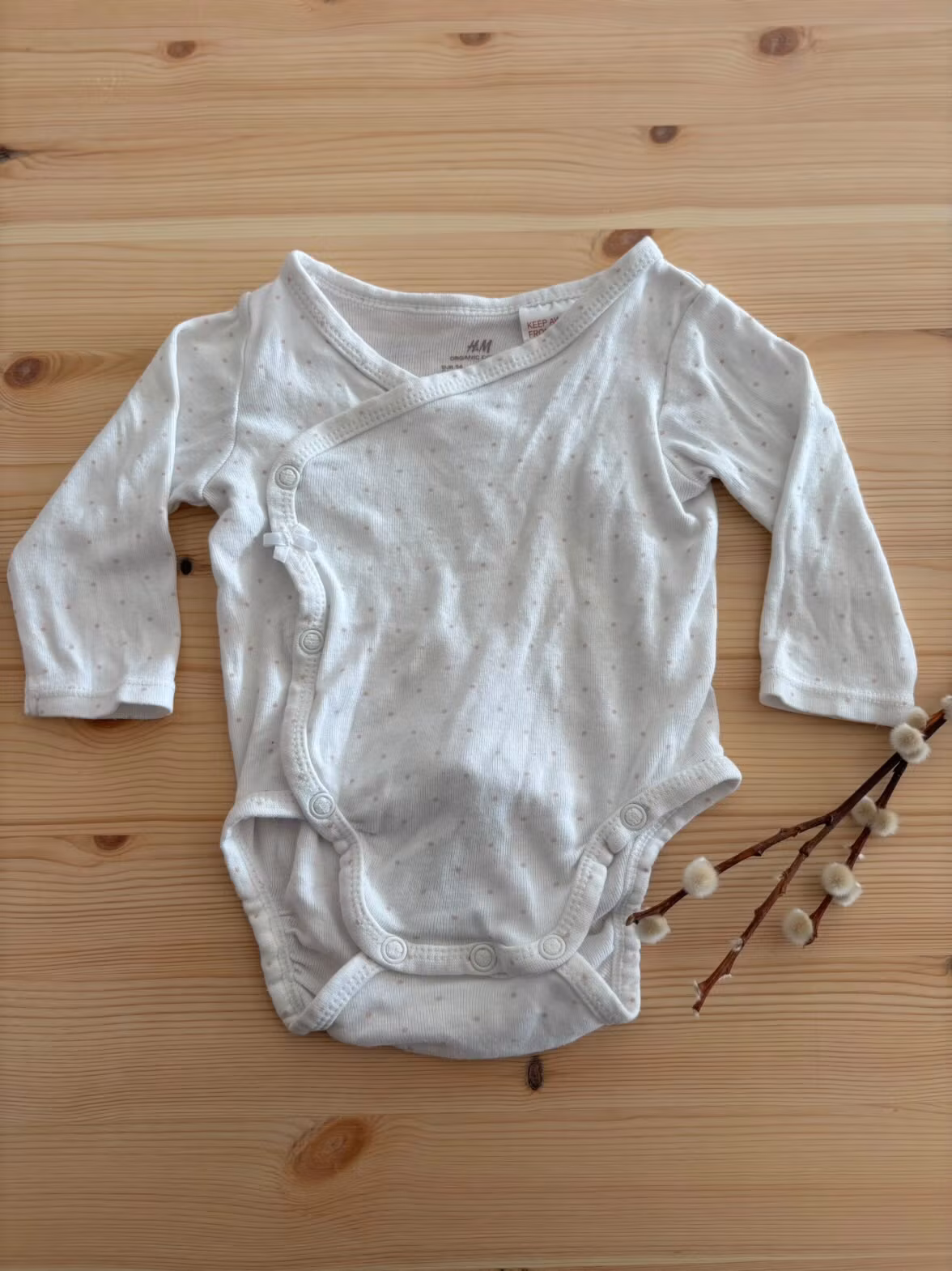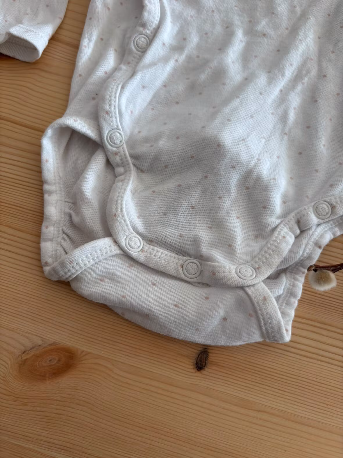 Söt body med ljusrosa prickar. Knäpps omlott och har en söt liten rosett vid knäppning.Kommer från H&M.Prisvärt och hållbart alternativ.