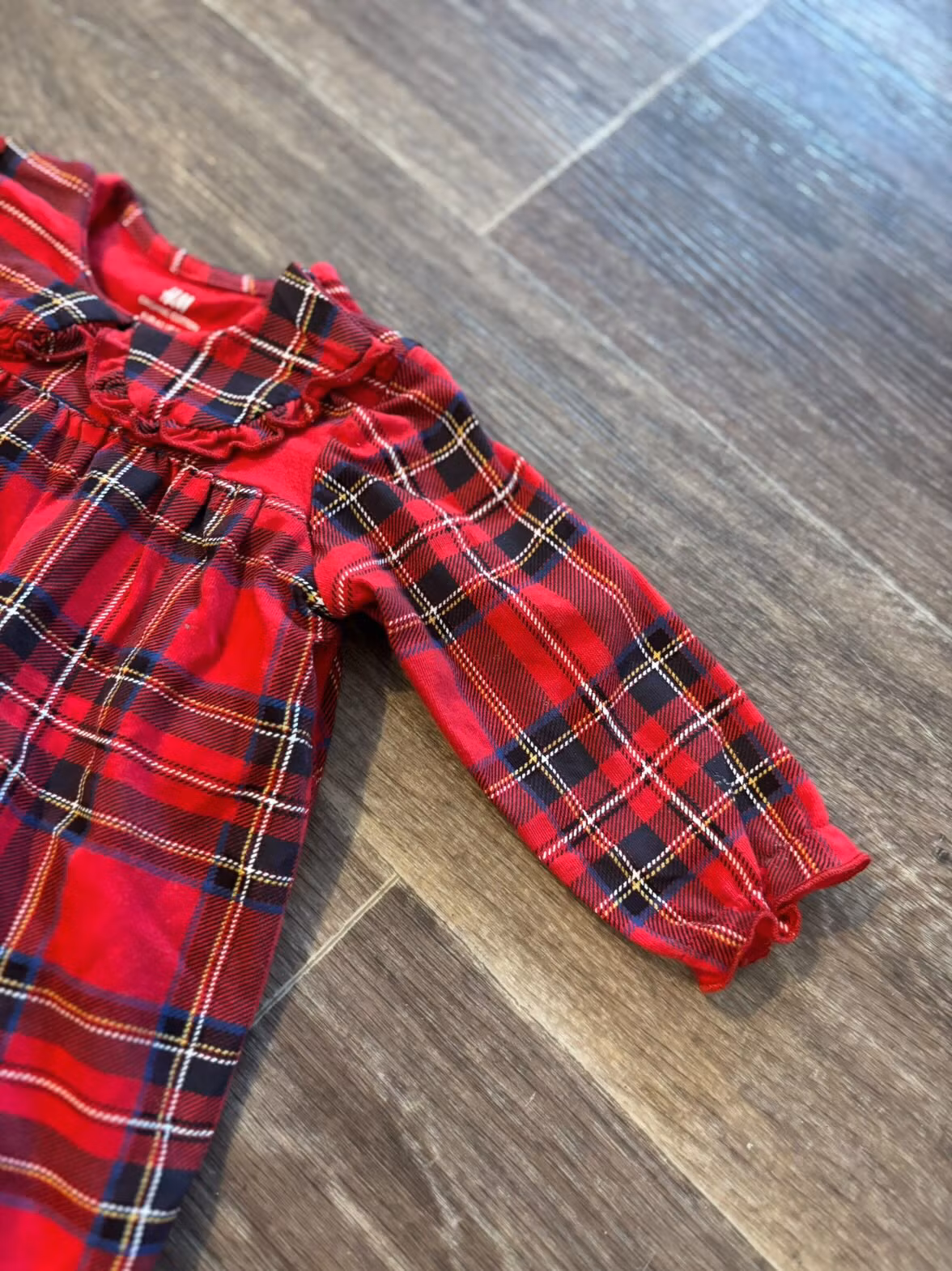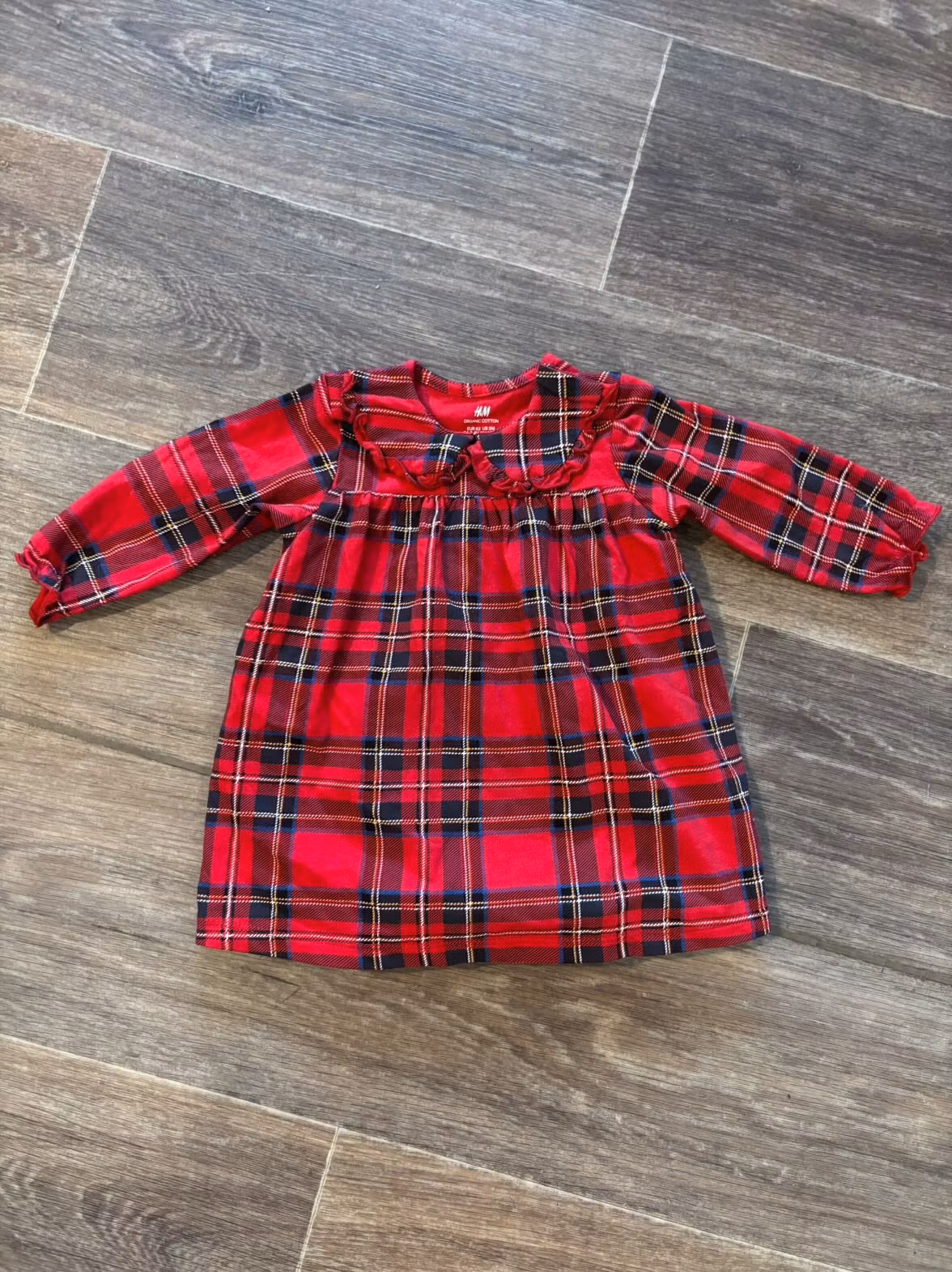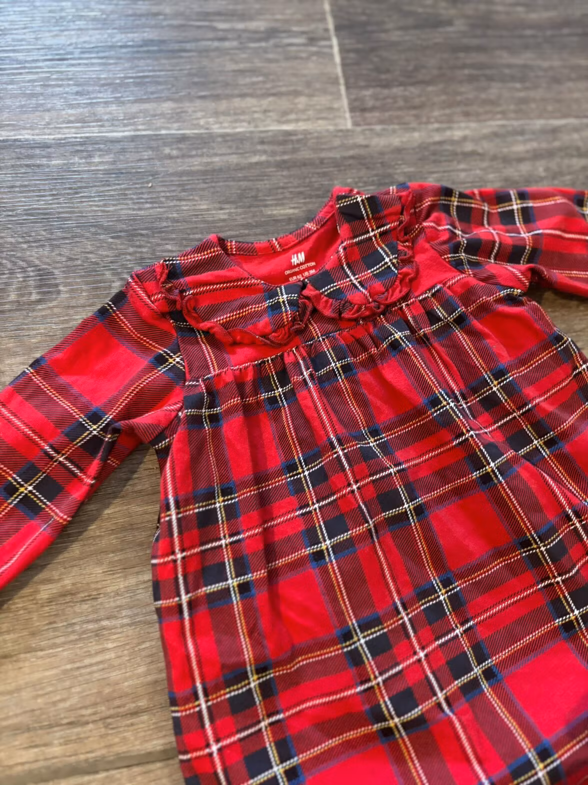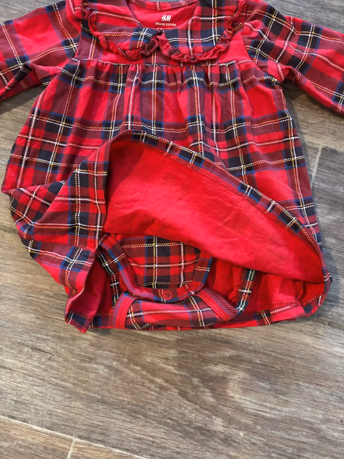 Röd rutig klänning med en body fastsydd undertill. Se bild. Otroligt smidigt. Passar toppen tillsammans med ett par strumpbyxor.Är i storlek 62 och kommer från