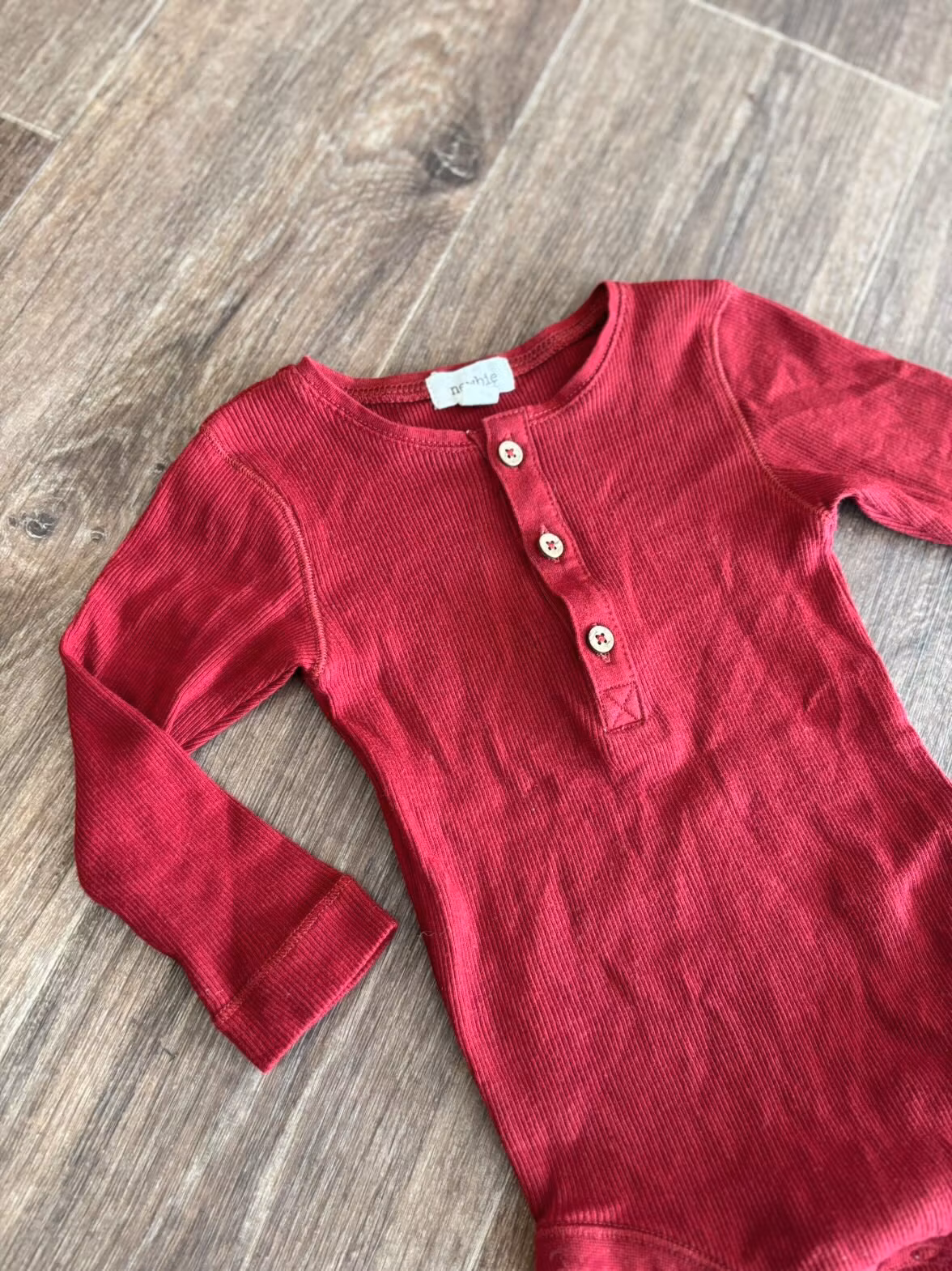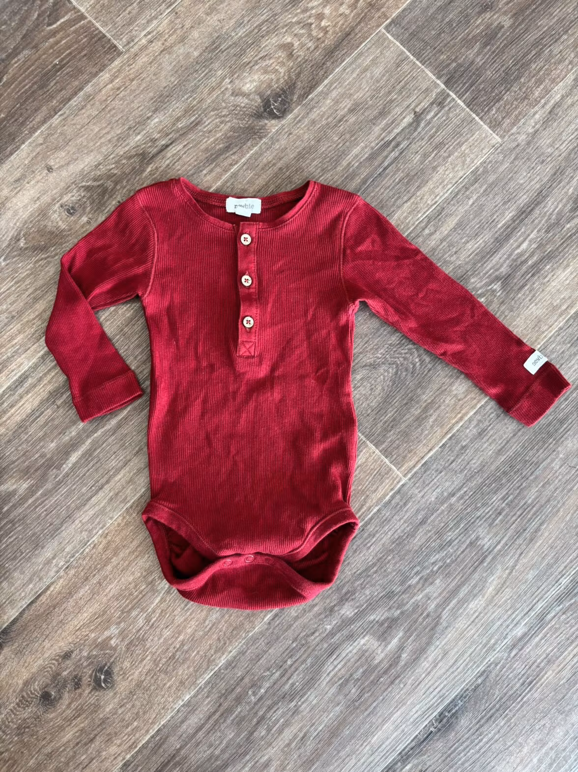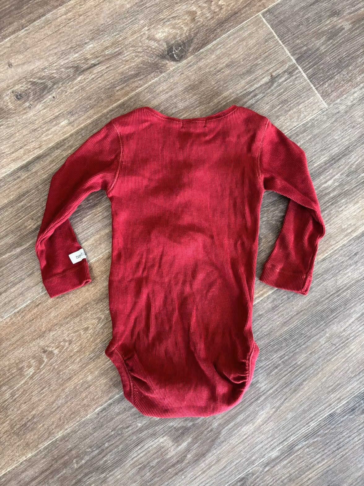 VINRÖD body från Newbie med tre bruna knappar.Bodyn är ribbad och passar utmärkt till tex jul.Storlek 80