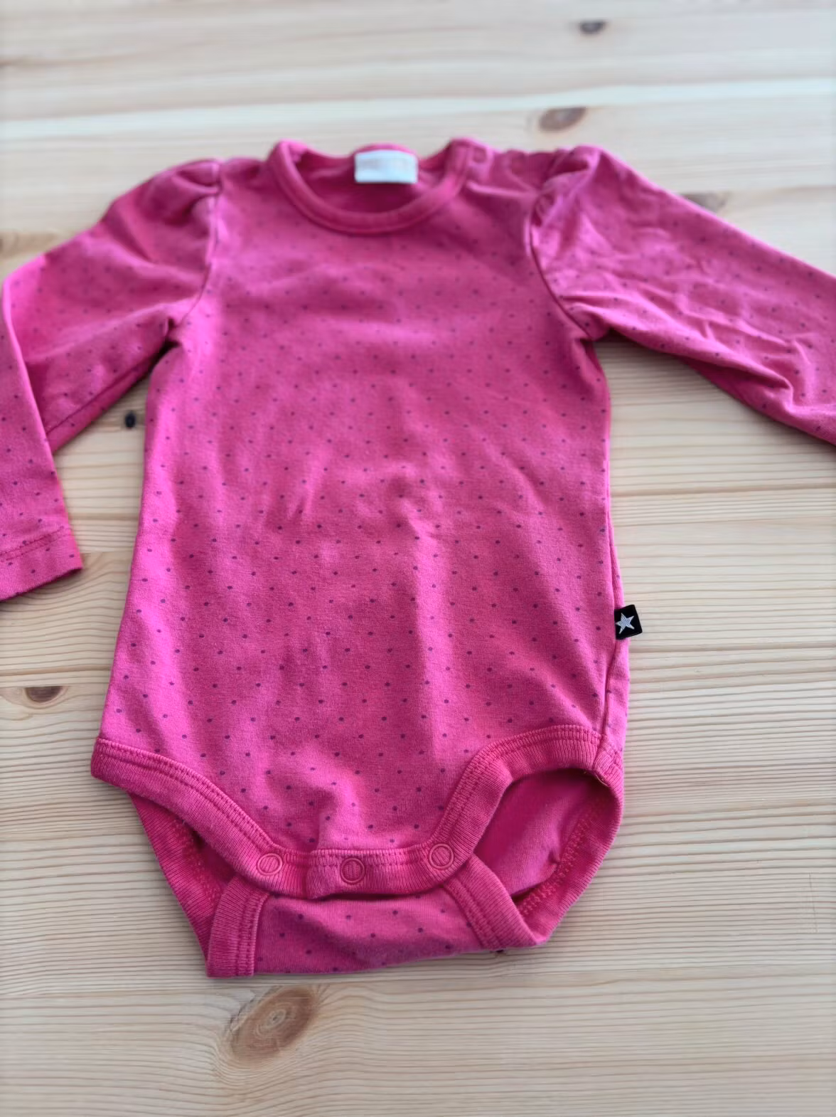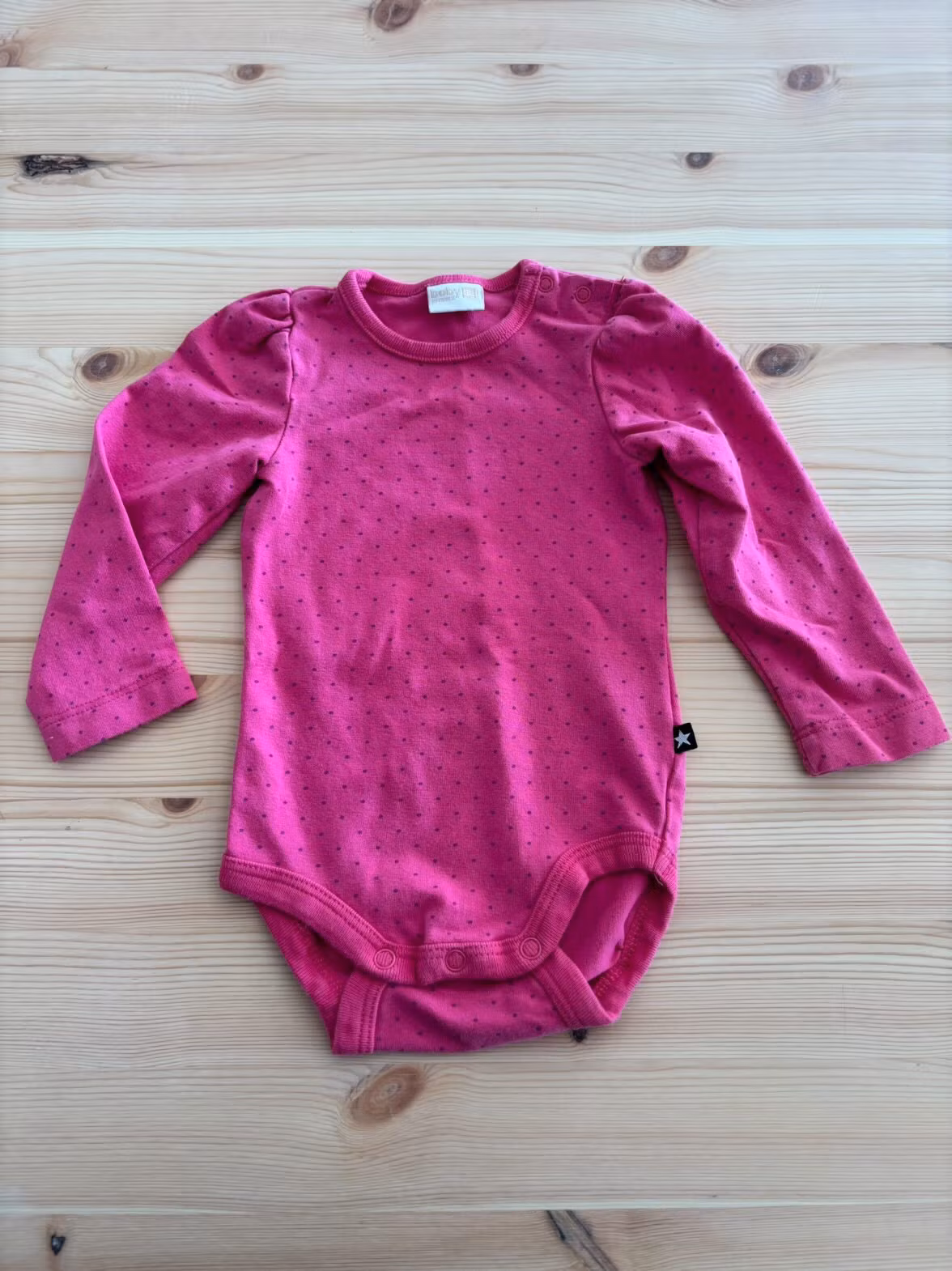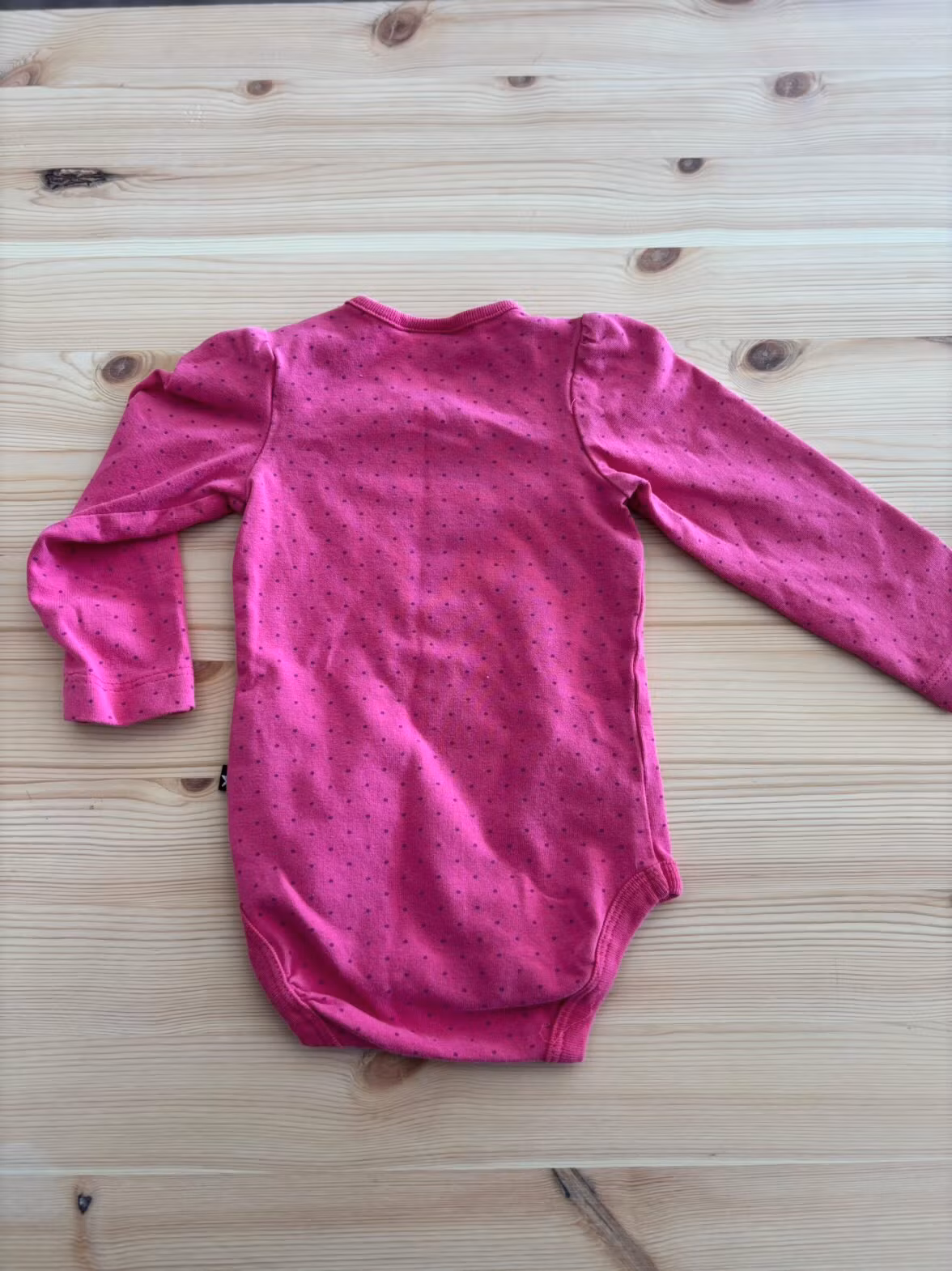 Prickig mörkrosa body i storlek 56.Kommer från baby by Lindex och har något puffiga axlar.två knappar uppe vid ena axeln.Prisvärt och hållbart alternativ.
