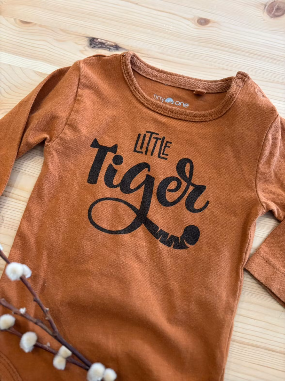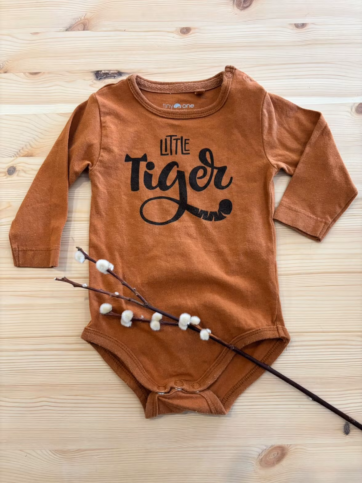 Fin body med texten ”little tiger”. Långärmad och har knappar vid ena axeln.Kommer från tiny one.Prisvärt och hållbart alternativ.