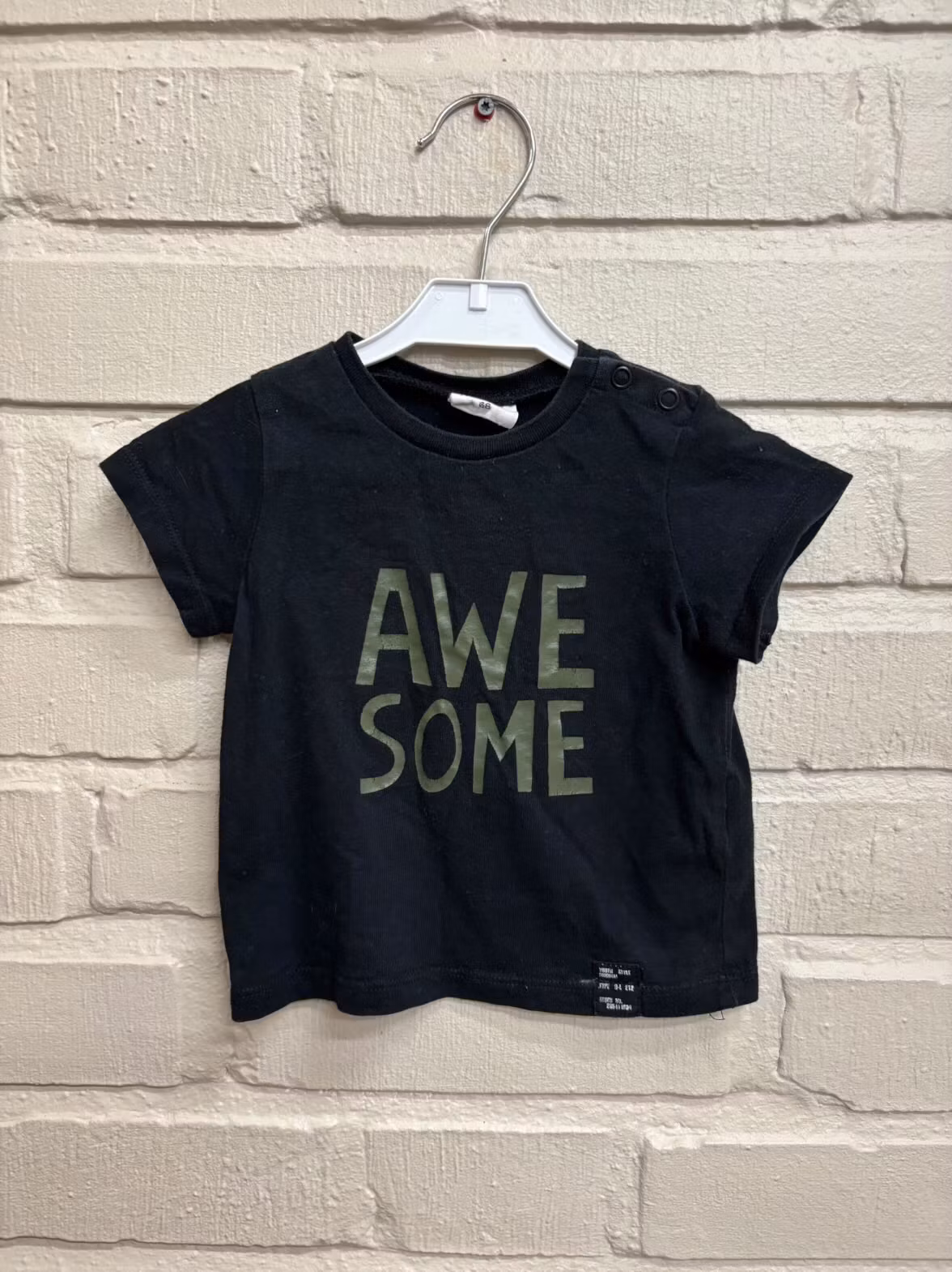 Kortärmad second hand T-shirt med tryck ”awesome”.Storlek 68 från design by Kappahl.Hållbart och prisvärt val.