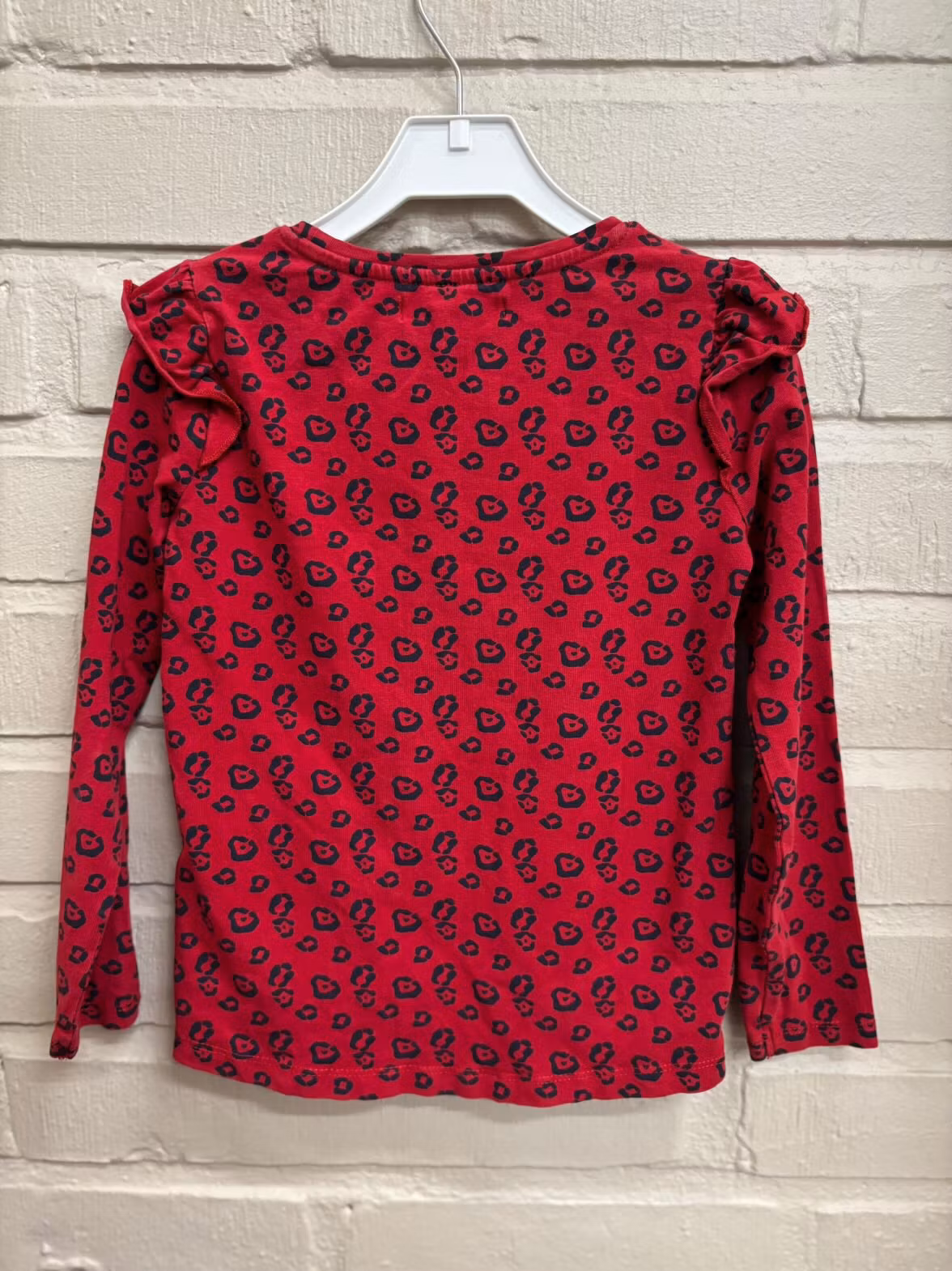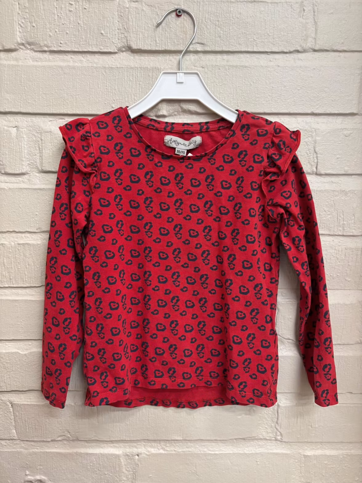 Leopardmönstrad second hand T-shirt.Är långärmad och har dekorativa axlar med volang.Storlek 110/116 och är ifrån Amy & Lucy.Hållbart och prisvärt val.