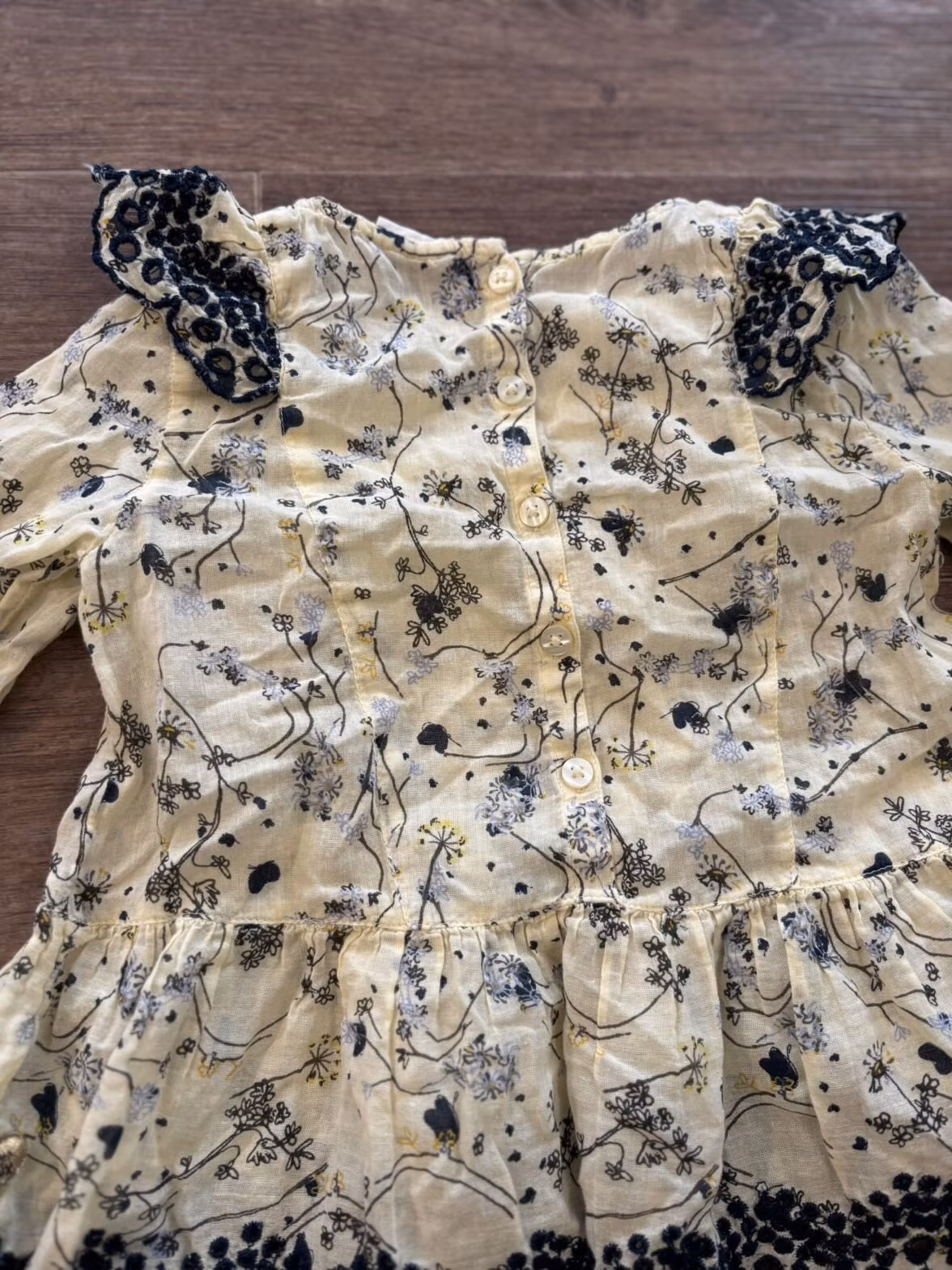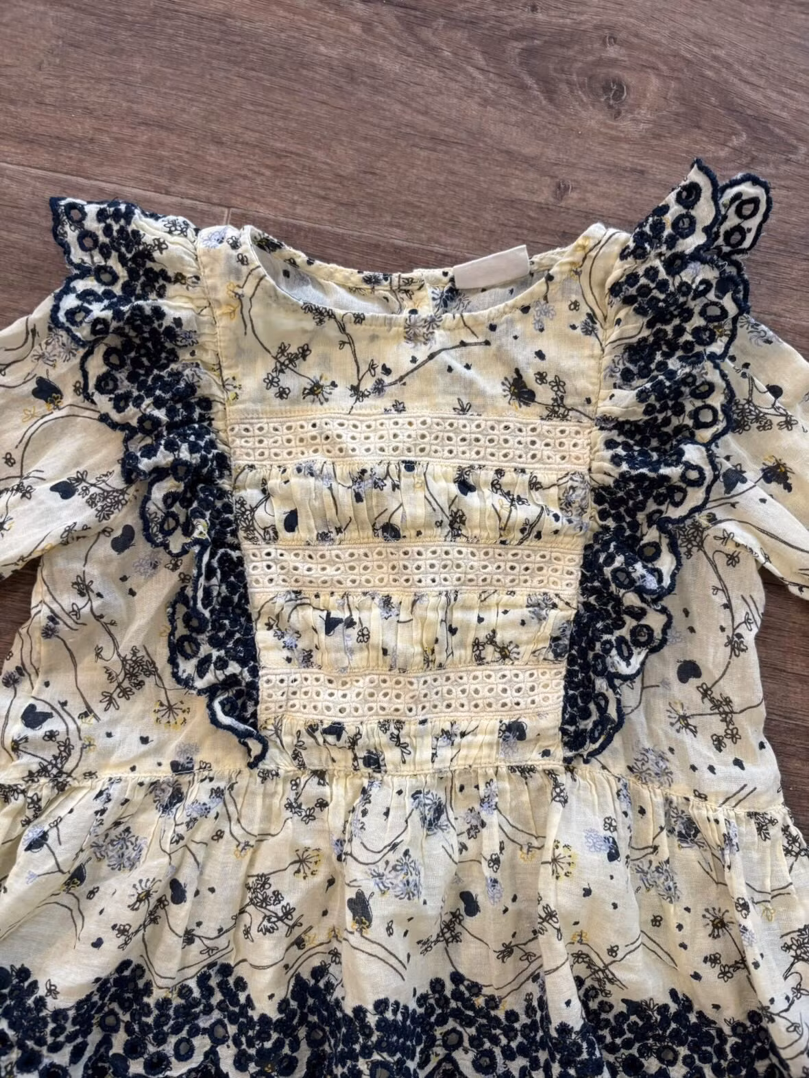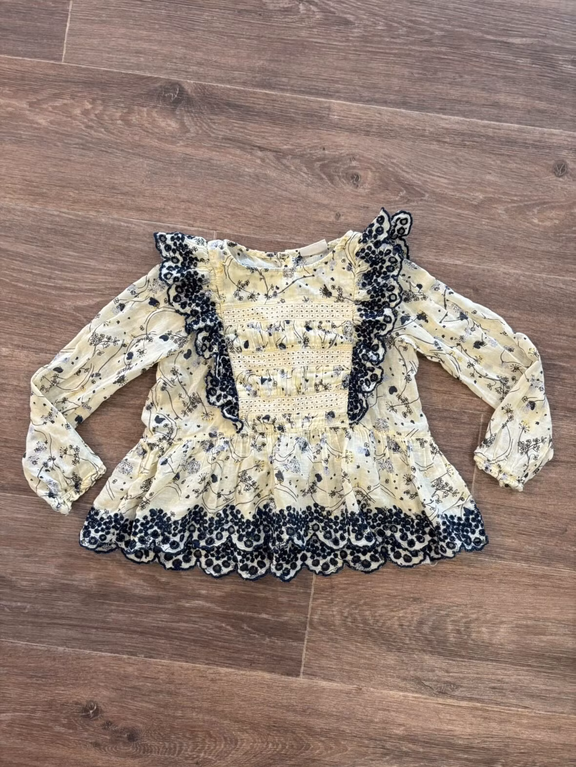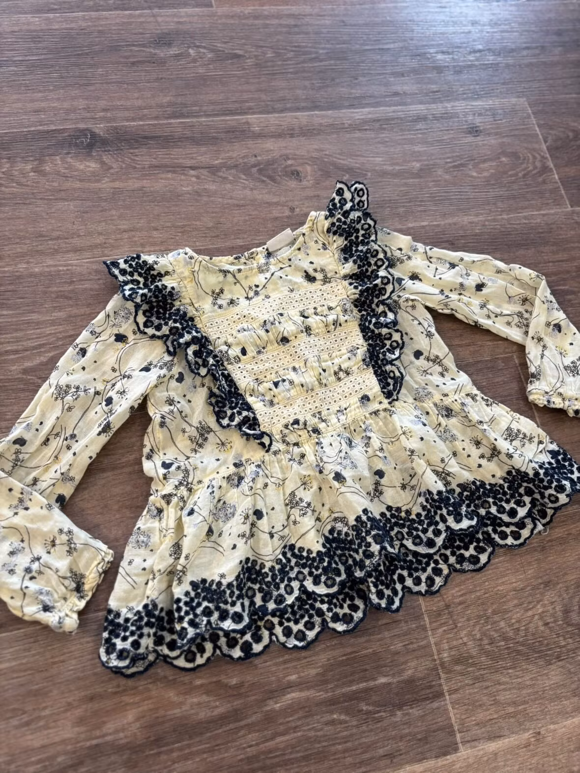 Väldigt vacker blus från PompDeLux i storlek 104.Härlig ljusgul färg, i tunt och skönt material. Söta blommor och vacker volang.Prisvärt och hållbart second han