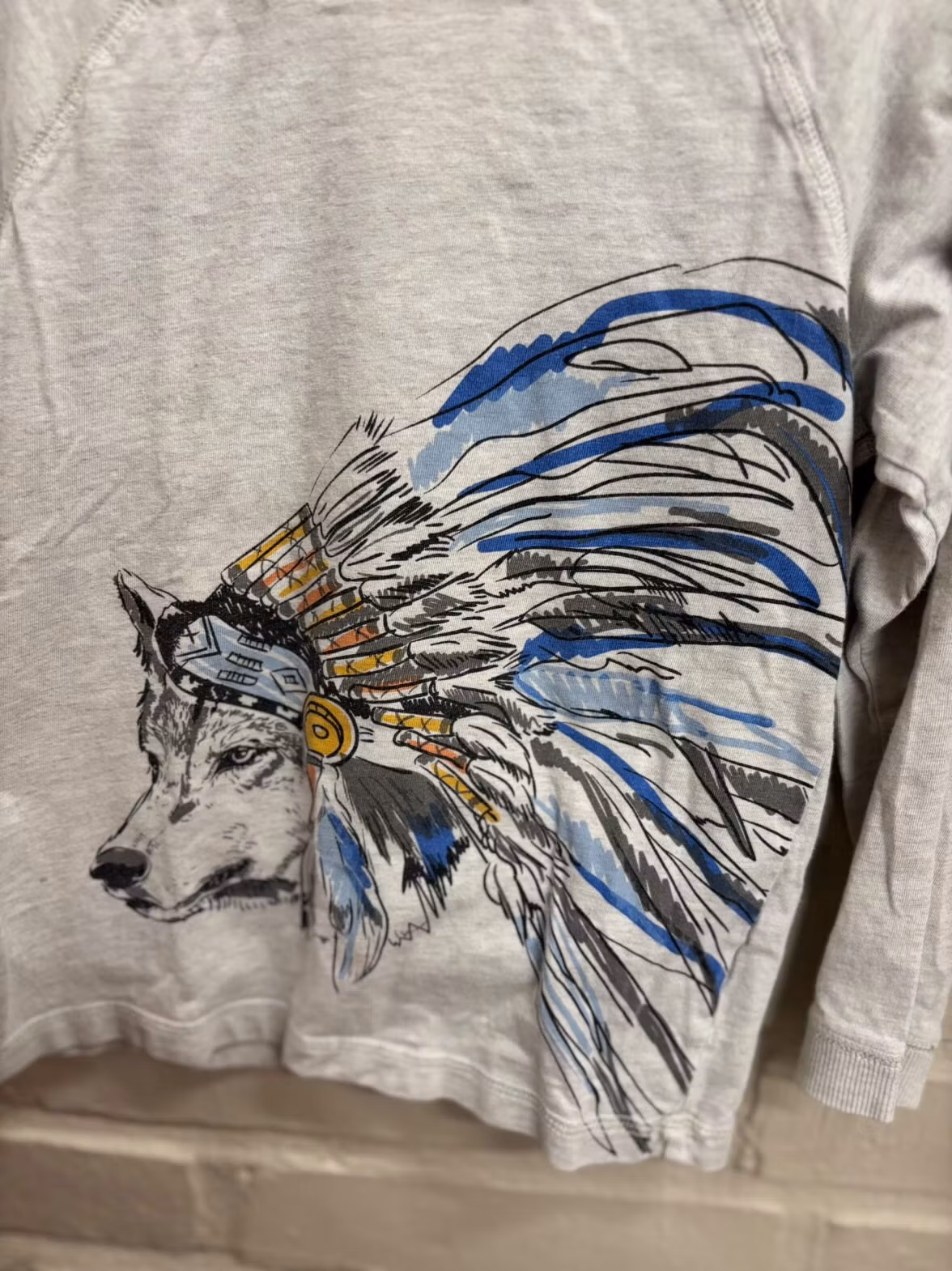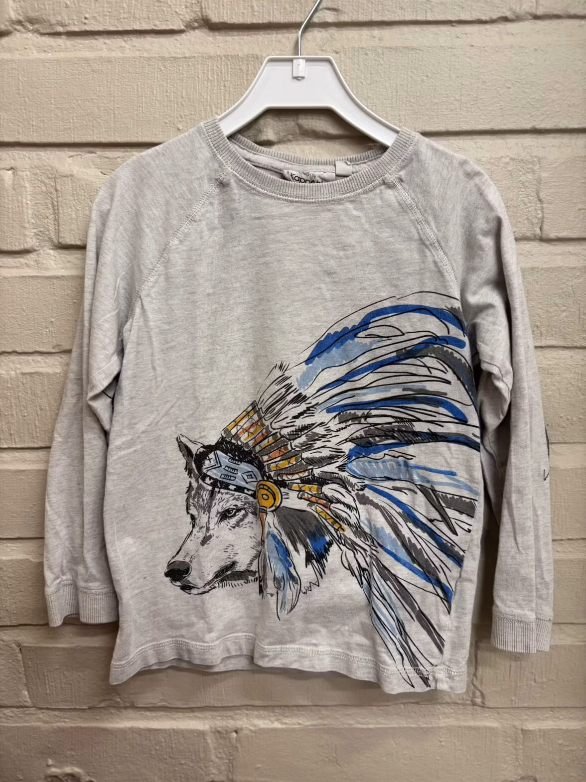 Långärmad second hand T-shirt med häftigt tryck på.I storlek 110/116 och kommer från design by Kappahl.Dekorativa armbågar, passar perfekt till vardags. Hå