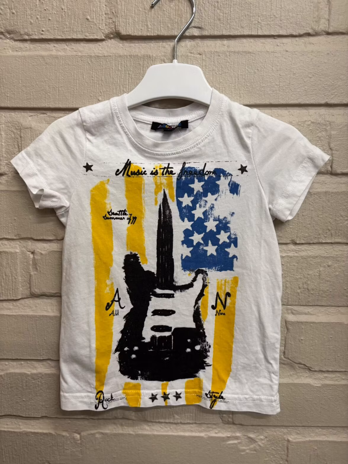 Snygg second hand T-shirt i storlek 92.Tryck med flagga och gitarr och är i märket Addnone.Hållbart och prisvärt alternativ.