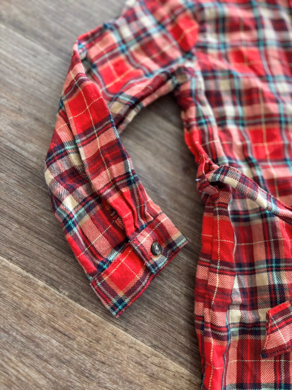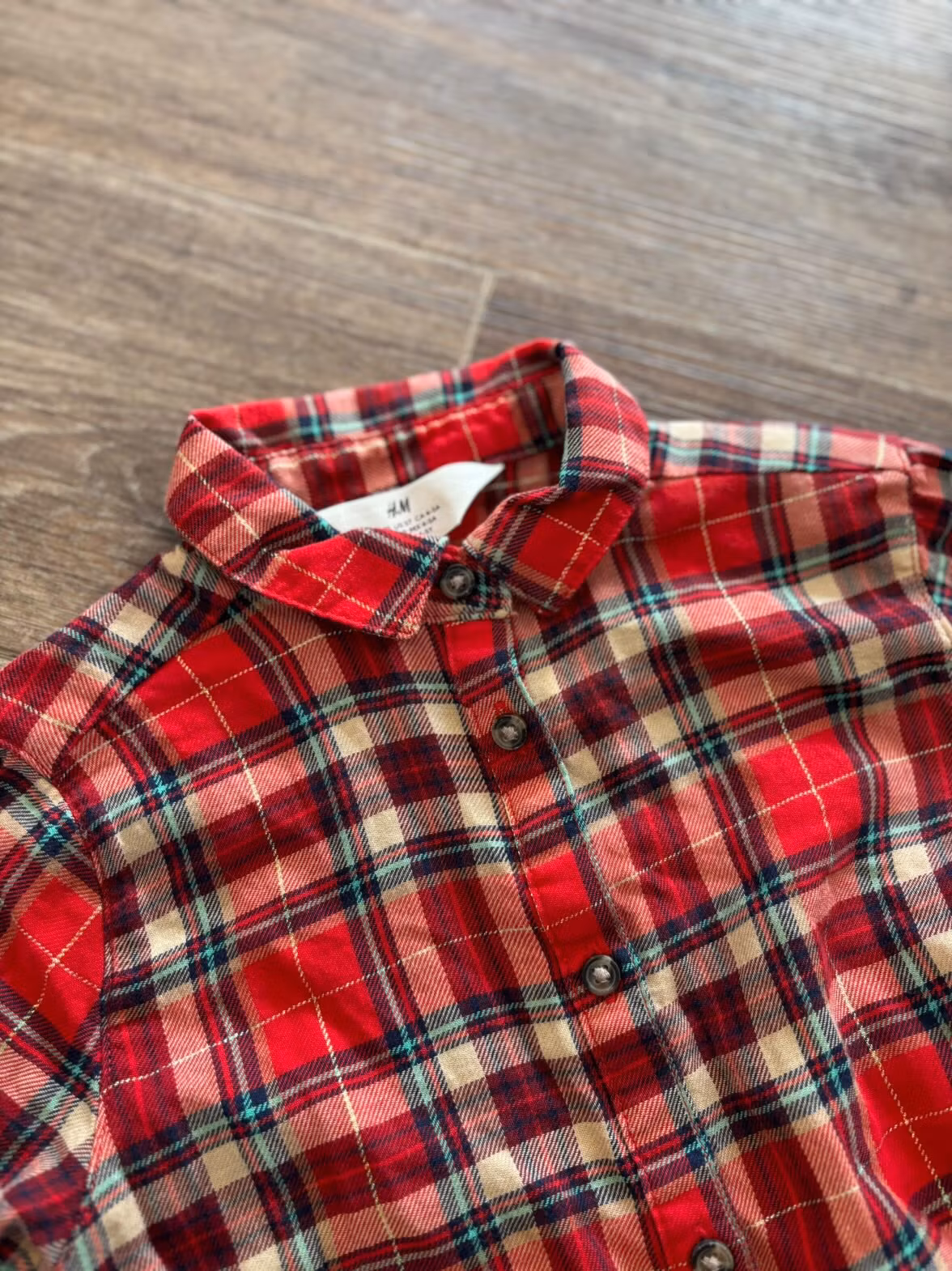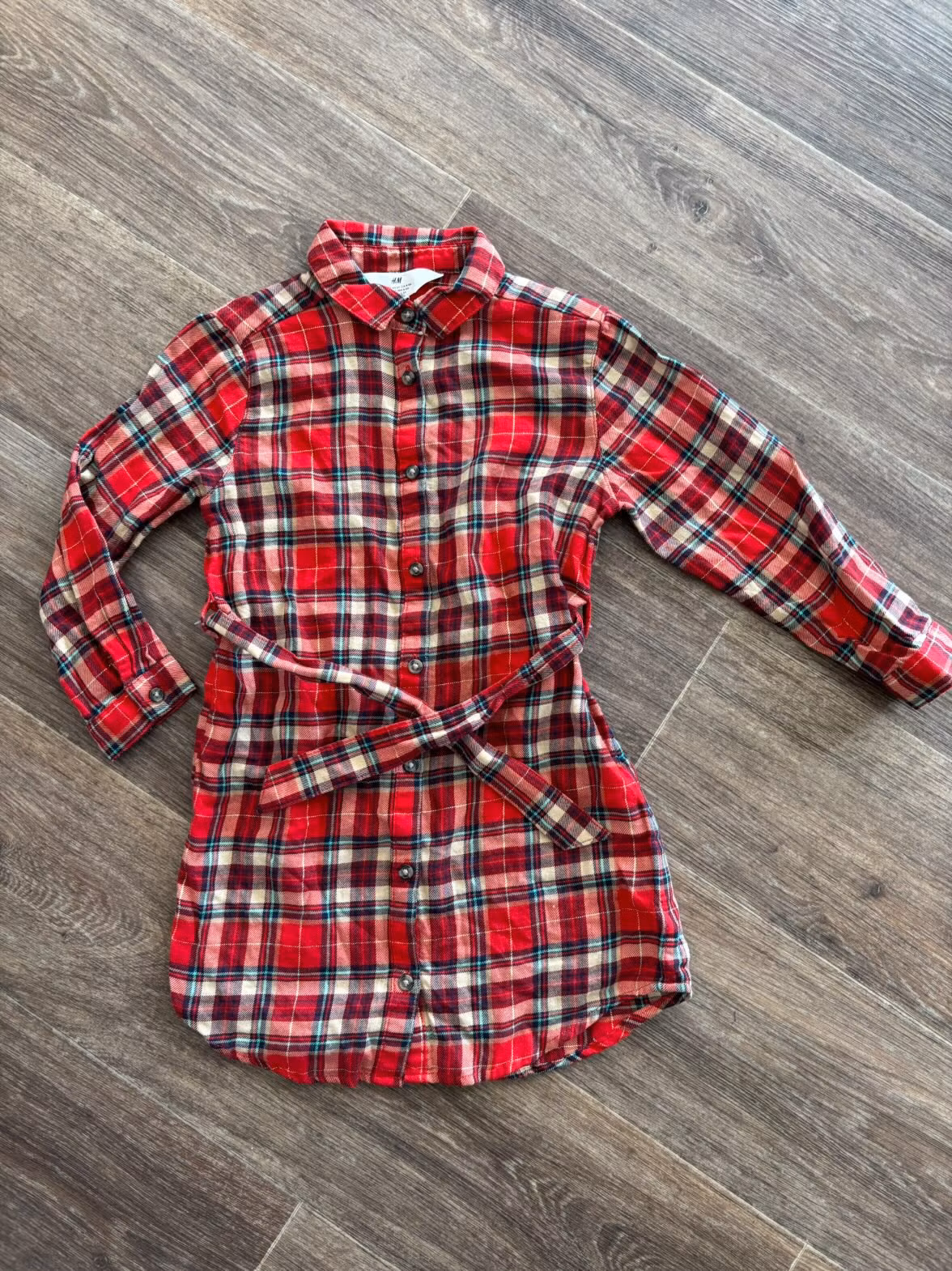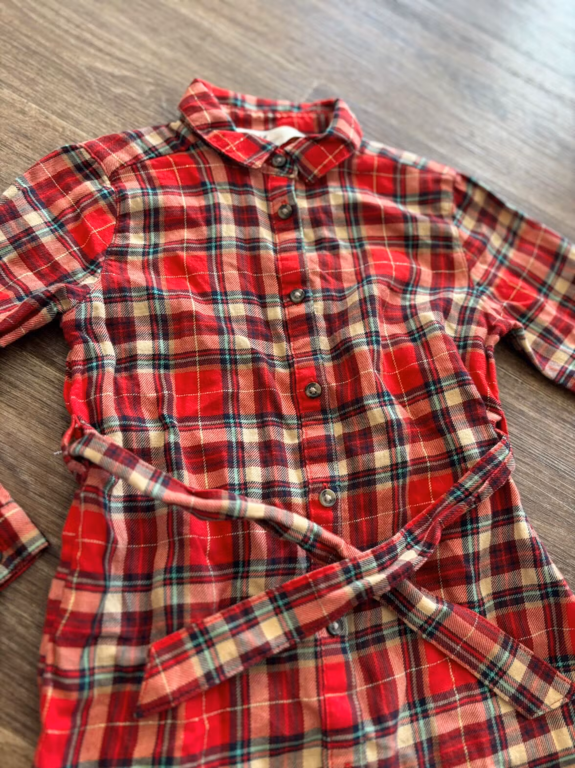 Rutig julinspirerad klänning med band i midjan.Den är i storlek 110 och kommer från H&M.Knappar hela vägen från kragen och ner, samt även vid armsluten.Väld