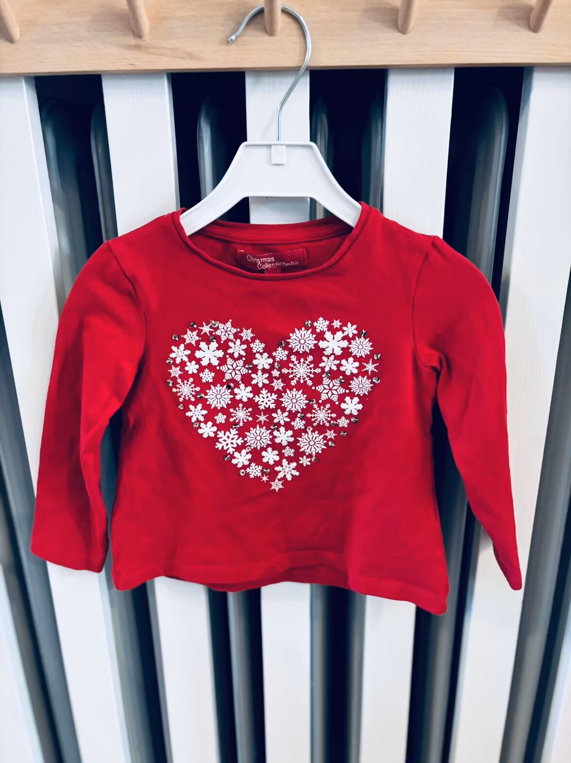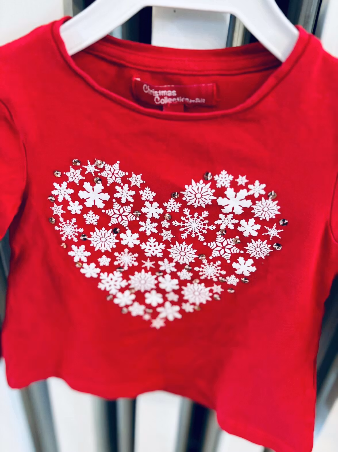 Julig långärmad tröja i härlig röd färg. Med motiv av ett hjärta skapat av snöflingor och paljetter.Storlek 86 och är i märket Christmas Collection by Skill.&nb